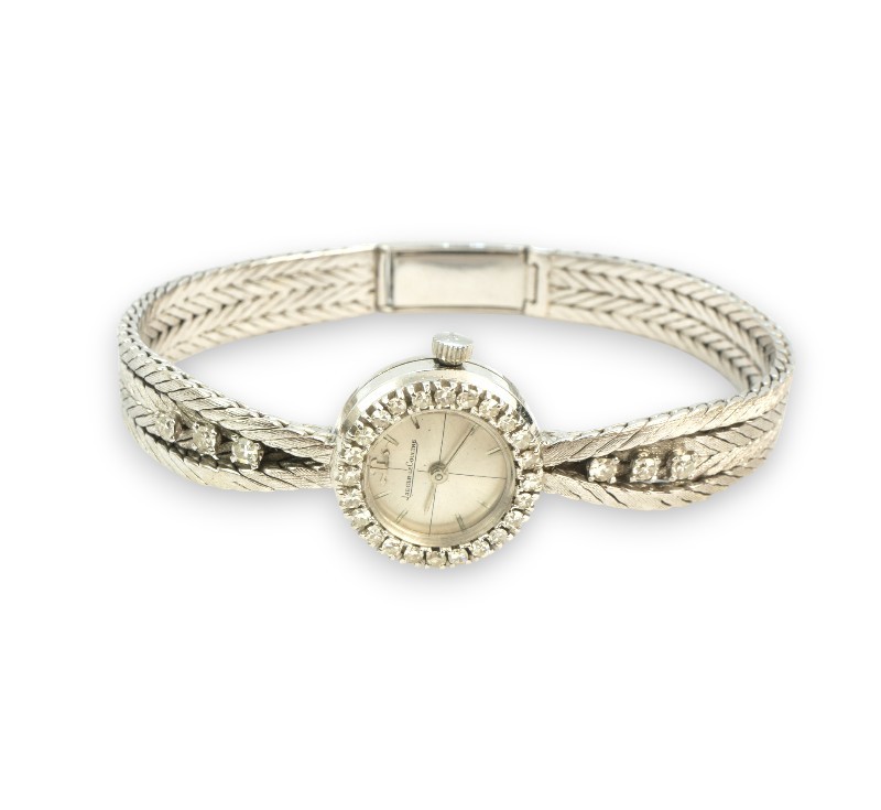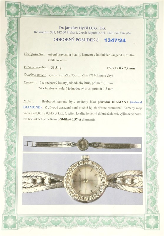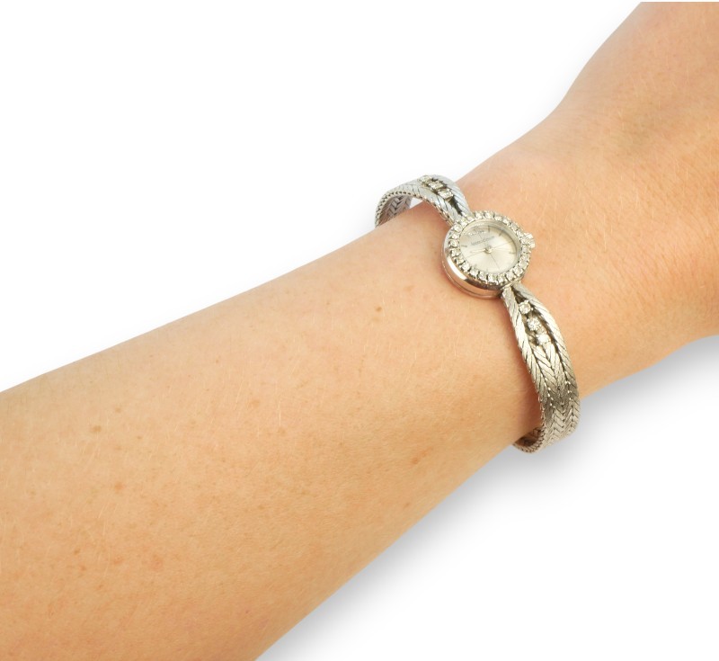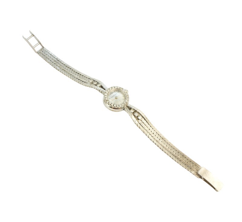 Elegantní hodinky ve formě náramku z bílého zlata ryzosti 750/1000 zdobené přírodními diamanty briliantového brusu celkové hmotnosti 0,57 ct. Délka 16 cm. Celková hmotnost 31,40 g. Ke šperku je přiložen odborný gemologický posudek (dr. Hyršl).