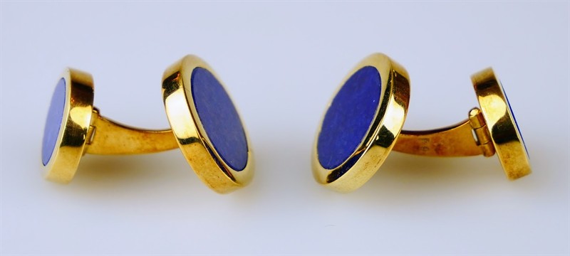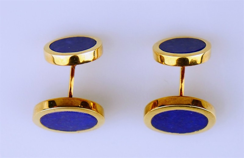 Majestátní masivní dvojité oválné manžetové knoflíky ze žlutého zlata s lapisem lazuli, celková hmotnost 26,90 g, Au 585/1000, český punc, ryzostní číslo a značka výrobce HM v kartuši. 4 x lapis lazuli oválného brusu výborné kvality. Rakousko, poslední třetina 20. století. Velikost přední části knoflíku 19,5 x 17,5 mm, zadní části 16 x 14 mm, délka 25 mm.