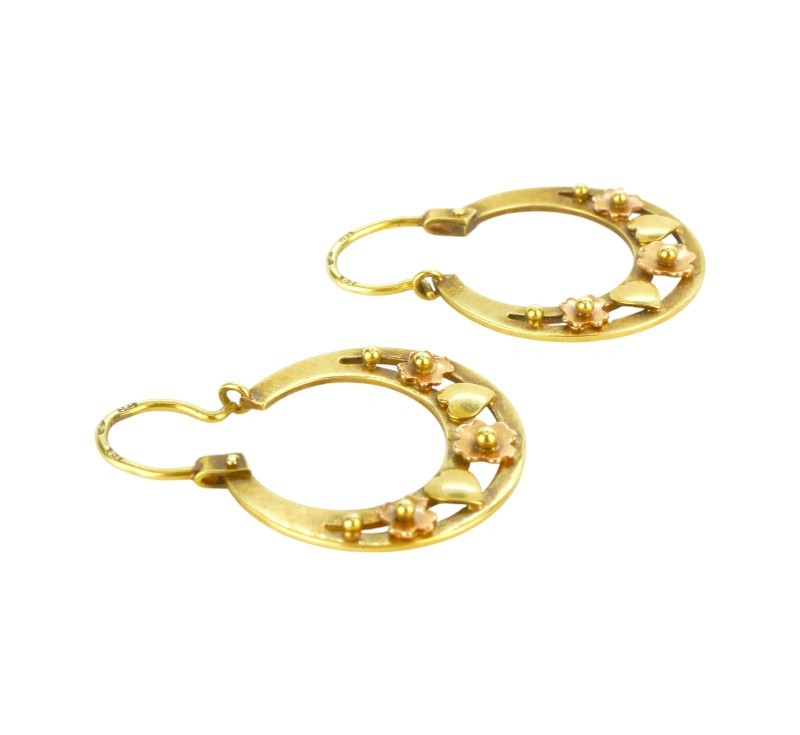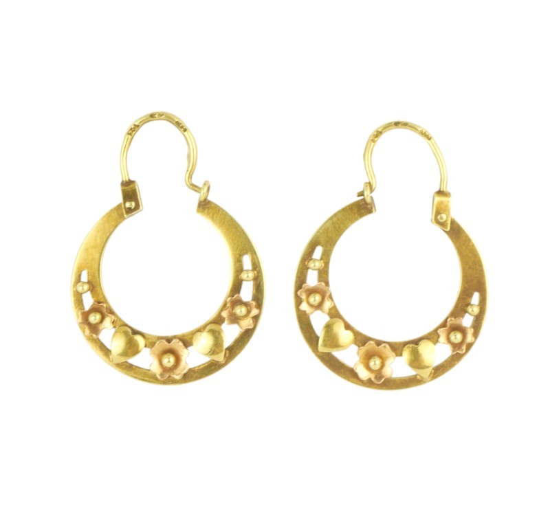 Náušnice ze zlata ryzosti 585/1000 (punc čejka) zdobené drobnými květinami a srdci. Rozměry 2,0 x 2,0 cm. Celková hmotnost 3,32 g.