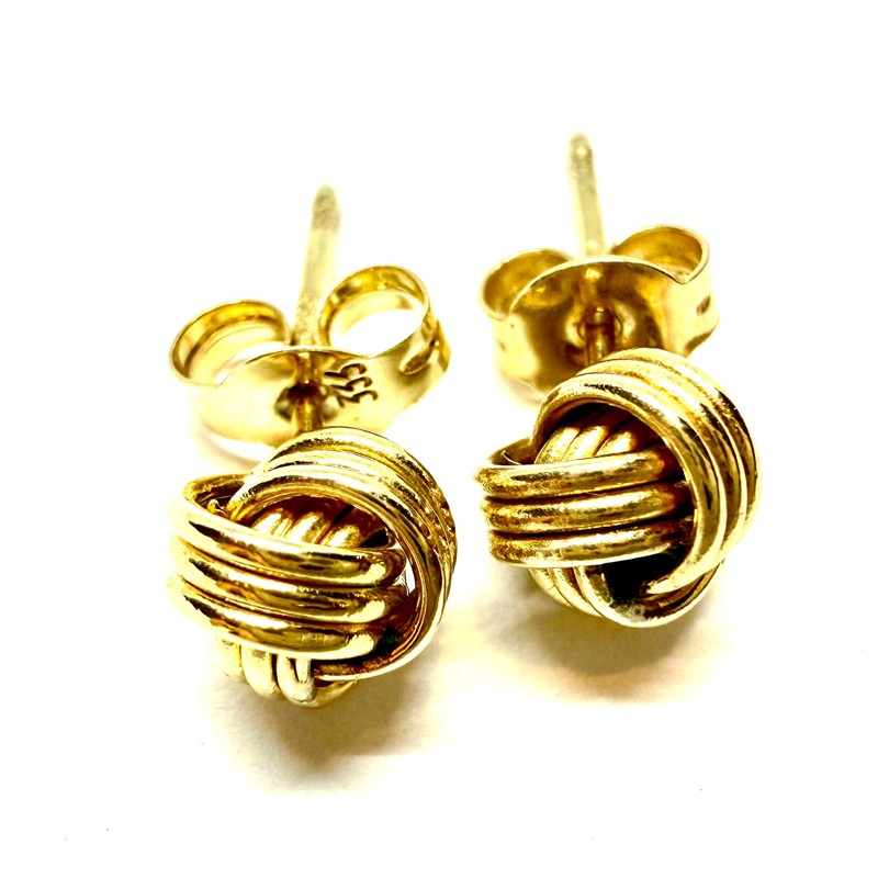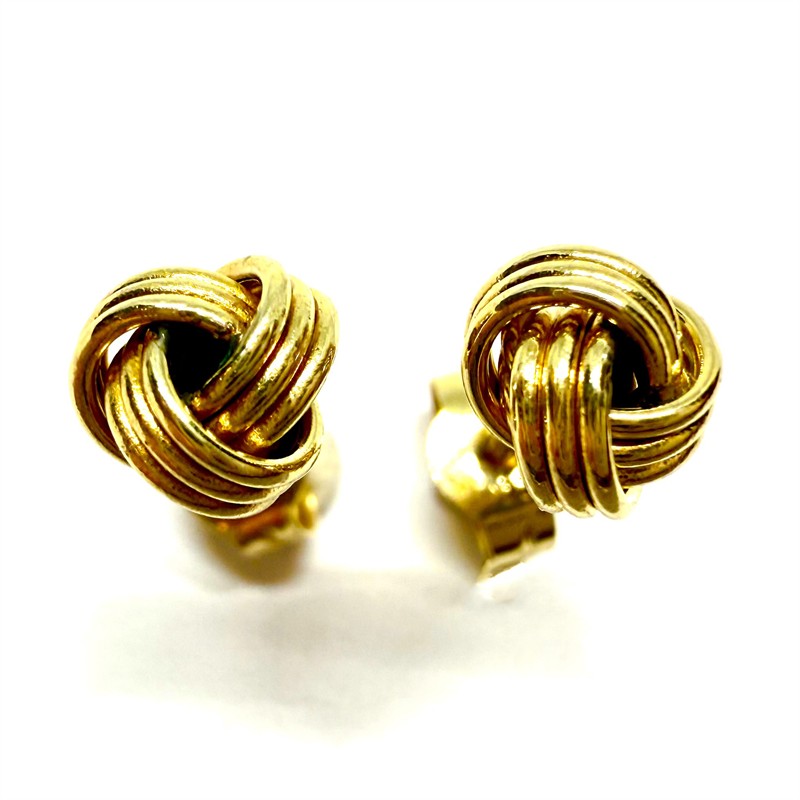 Půvabné, elegantní zlaté náušnice se zapínáním na puzetu. Náušnice byly zhotoveny ze zlata ryzosti 333/1000, o celkové váze 0,62 g. Průměr uzlíku 6 mm. Příjemně nositelný šperk ve výborném stavu.