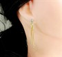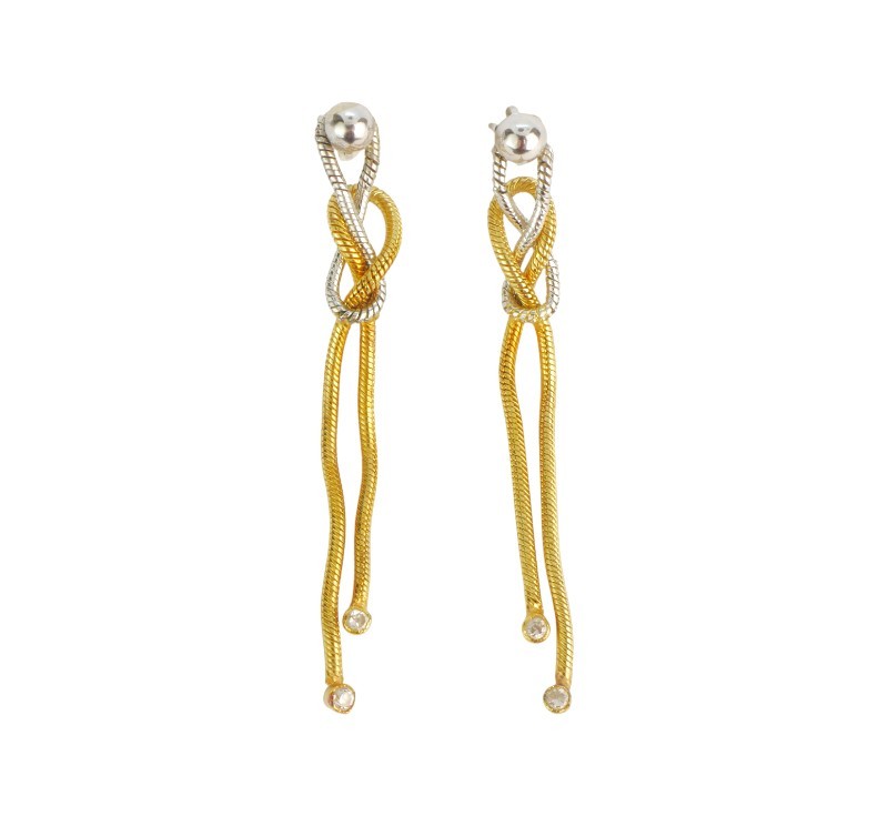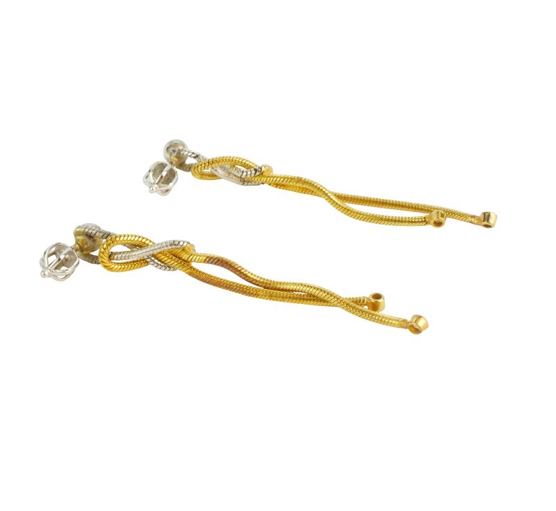 Moderní náušnice zhotovené na zakázku v kombinaci žlutého a bílého zlata ryzosti 585/1000. Celková hmotnost obou náušnic je 4,53 g. Délka náušnice je 5 cm.