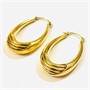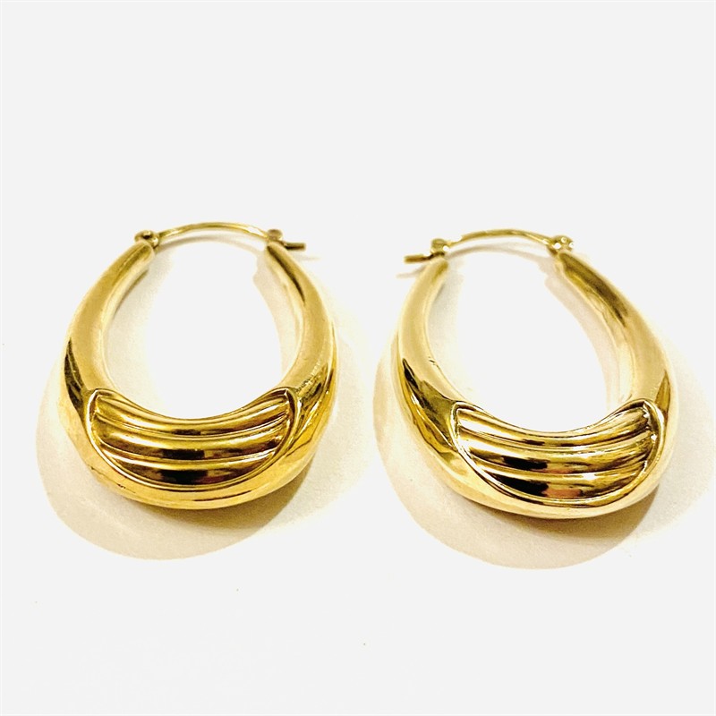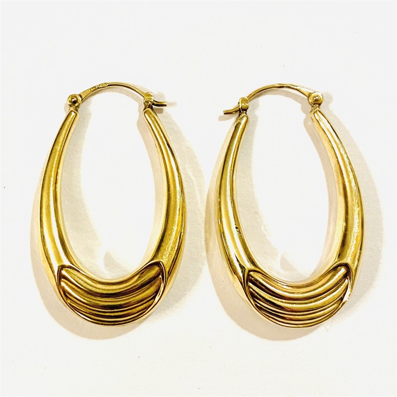 Nápadné náušnice v podobě provislých oválů s plastickými pruhy po bocích. Nadčasový, dobře kombinovatelný šperk, vyrobeno technikou dutého kovu, německá zlatnická práce z poslední třetiny 20. století. Zhotoveno ze žlutého 8 karátového zlata, tj. o ryzosti 333/1000; nově opatřeno punc Z-59 (písmeno Z s květinou) a ryzostní číslo na dřících. Hmotnost 3,16 g, délka 36 mm, šířka 21 mm. Zapínání v pořádku, celkově v zachovalém stavu, odborně vyčištěno a vyleštěno zlatníkem.