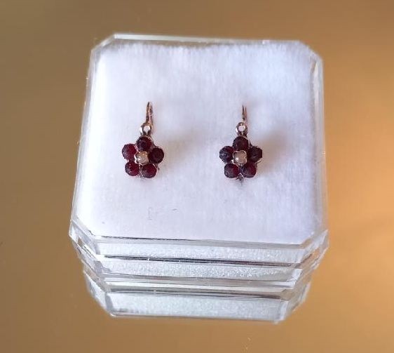 Dětské náušnice s českými granáty a perličkami jsou puncované platným českým puncem pro zlato 14 kt 585/1000 a váží 1,00 gramů. Na každé náušnici je 5 českých granátů a uprostřed je perlička. Na výšku měří náušnice 1,5 cm. Granáty s perličkou tvoří na náušnice kytičku.
