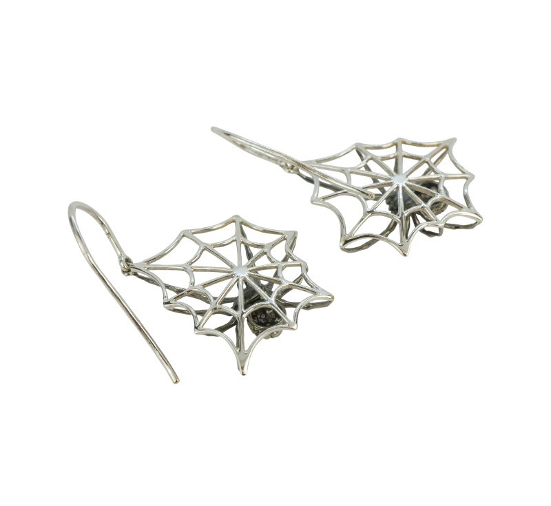 Visací náušnice z bílého zlata ryzosti 750/1000 ve tvaru pavučin s pavoučky, zdobené drobnými brilianty. Rozměry 2,5 x 2,54 cm. Celková hmotnost 3,75 g.