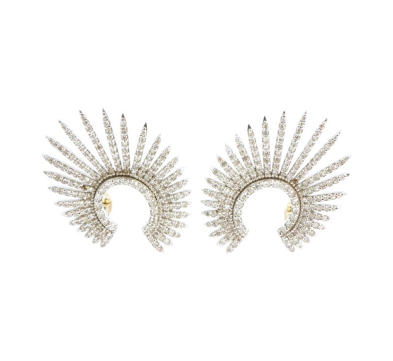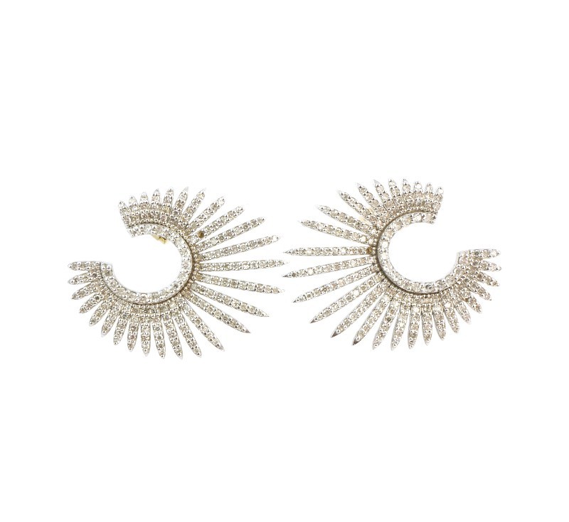 Netradiční náušnice ze zlata ryzosti 585/1000 zdobené diamanty briliantového brusu o celkové hmotnosti 2,5 ct. Rozměry 2,7 x 2,1 cm. Celková hmotnost 8,12 g.
