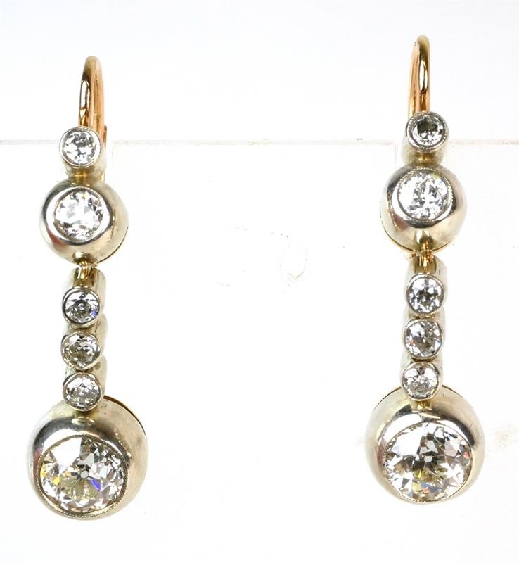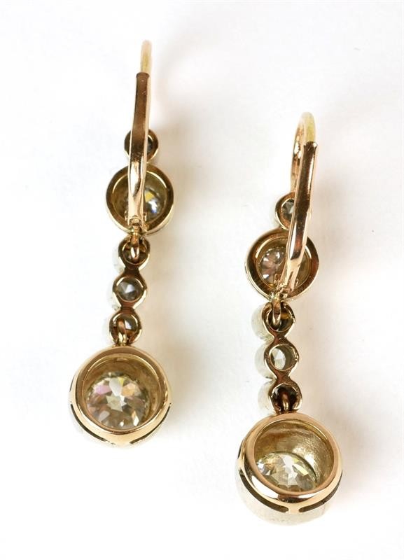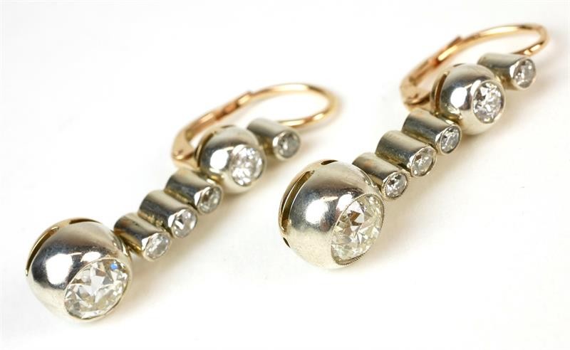 Zlaté náušnice zdobené brilianty o celkové hmotnosti 2,90 ct. (2x1,05 ct, 2x0,16 ct a 8x0,06 ct) čistota VS2 - SI1, barva H-I. Zlato ryzosti 585/1000. Délka 3,3 cm, celková hmotnost 6,35 g. Znalecký posudek briliantů doložen.
