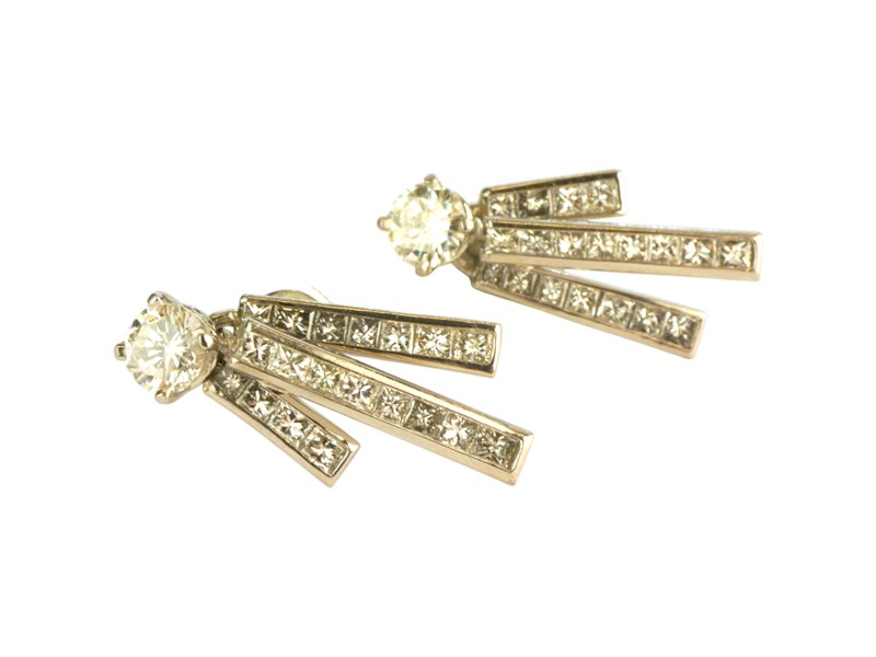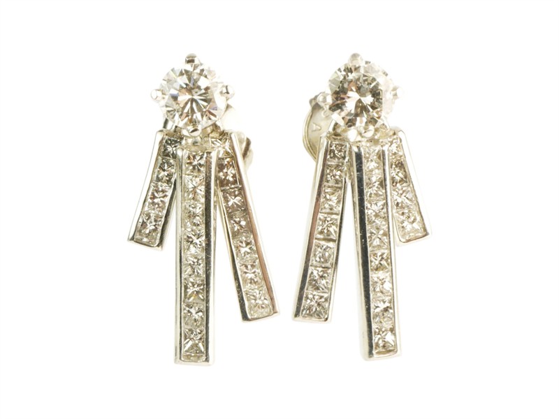 Zajímavé náušnice z bílého zlata ryzosti 585/1000 zdobí dva přírodní diamanty briliantového brusu celkové hmotnosti 0,78 ct a ověsy zdobí 38 diamantů brusu princess celkové hmotnosti 1,52 ct. Všechny kameny mají vzácně bílou barvu F-G-H a jejich celková hmotnosti je 2,30 ct. K dispozici je takécertifikát České gemologické laboratoře. Délka náušnic je 2 cm, celková hmotnost 5,46 gramů. Vkusný a hodnotný šperk vhodný pro slavnostní příležitosti i jako reprezentativní dar.