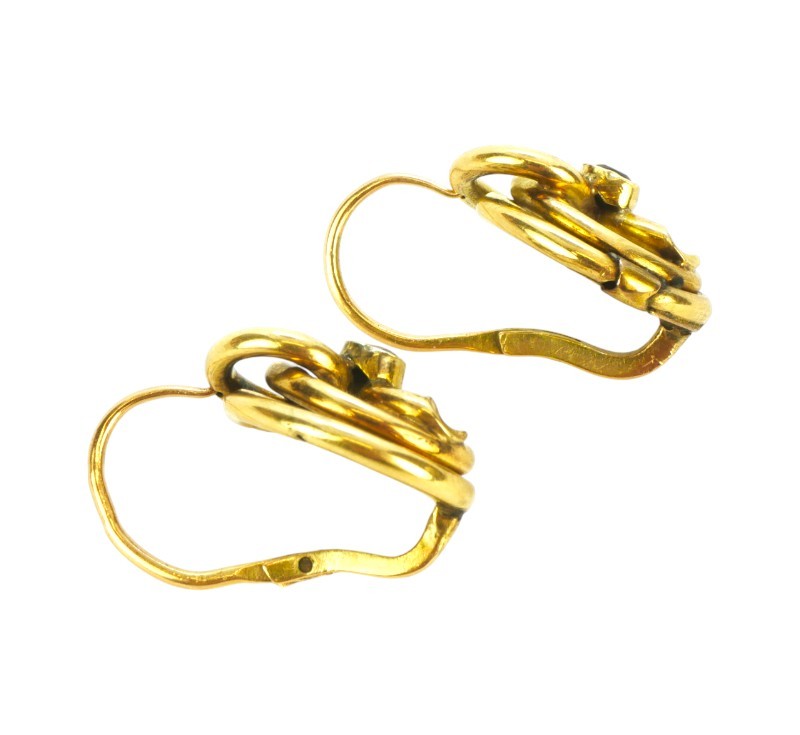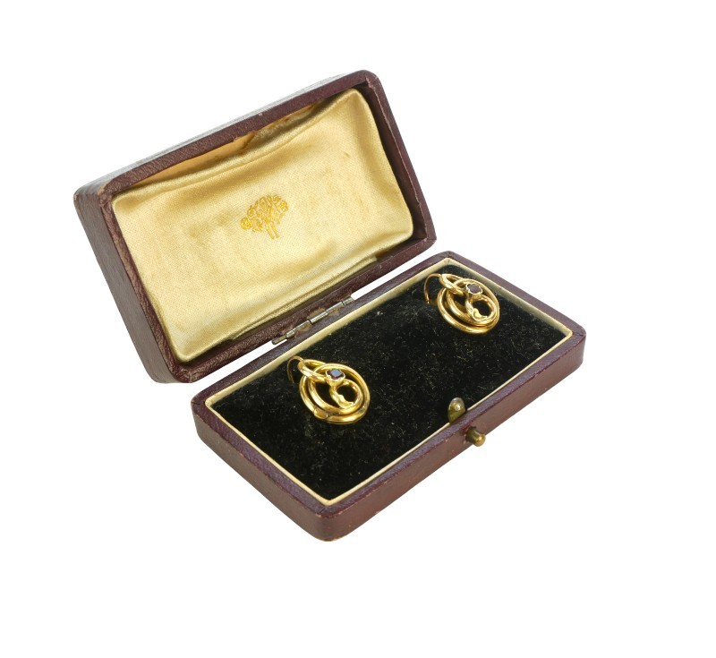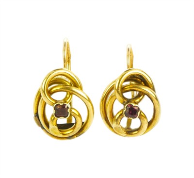 Náušnice ze zlata ryzosti 333/1000 ve tvaru uzlů s červenými kameny. Rozměry 1,7 x 1,5 cm. Celková hmotnost 3,28 g.