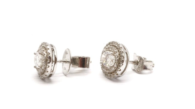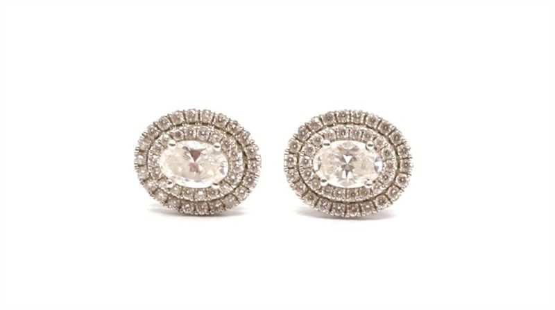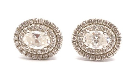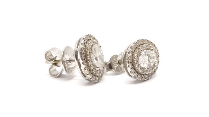 Zlaté náušnice s diamanty. Bílé zlato 750/1000. Přírodní diamanty, kvalita VS2 - SI2, barva H - I, celková váha 1 ct. Váha náušnic: 2,94 g. Rozměr náušnic: 1,1 cm 0,8 cm.