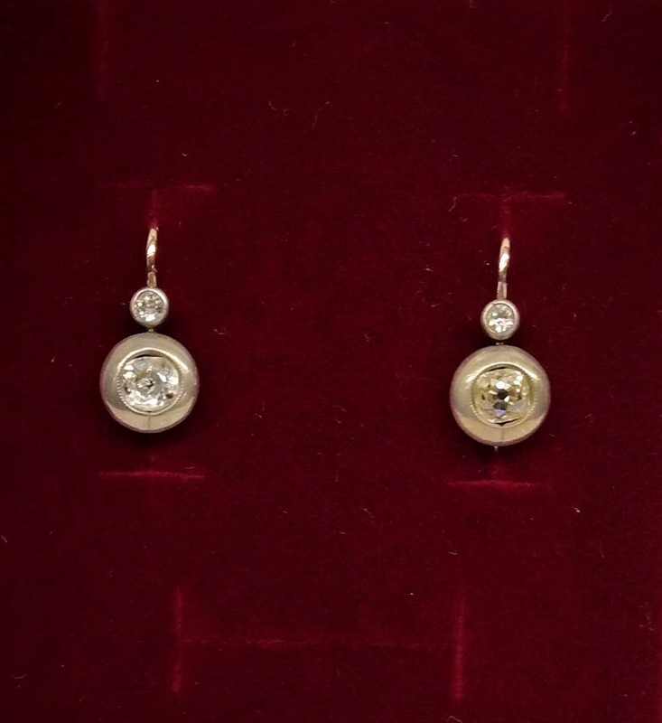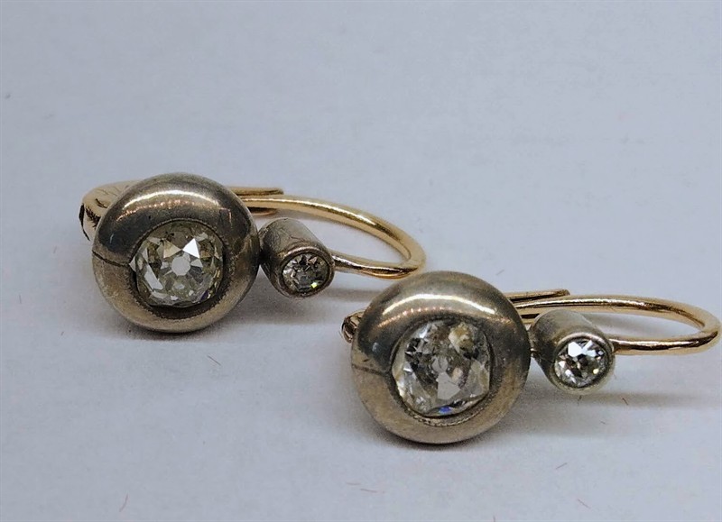 Zlaté secesní náušnice, tzv. sněhuláci, s diamanty starého briliantového brusu zasazenými ve stříbře, celkem 0,74 ct. Celková hmotnost 2,95 g, Au 580/1000, punc liška (Z - 27) Budapešť, odborný posudek. Klasické pevné patentní zapínání, velmi dobrý stav. Maďarské království, konec 19. století. Celková délka náušnic s háčkem 1,7 cm, bez háčku 1,1 cm, šířka 0,8 cm.