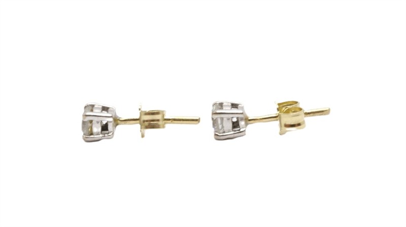 Zlaté náušnice s diamanty. Bílé a žluté zlato 750/1000, puzety žluté zlato 585/1000. Přírodní diamanty, kvalita SI1 - SI2, barva I - J, celková váha 0,32 ct. Váha náušnic: 0,99 g. Průměr náušnic: 0,4 cm.