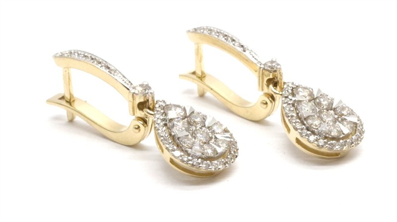 Zlaté náušnice s diamanty. Žluté zlato 585/1000. Přírodní diamanty, kvalita VS2 - SI1, barva G - H, celková váha 1,15 ct. Váha náušnic: 4,33 g. Délka náušnic: 2,9 cm.