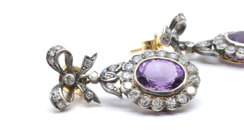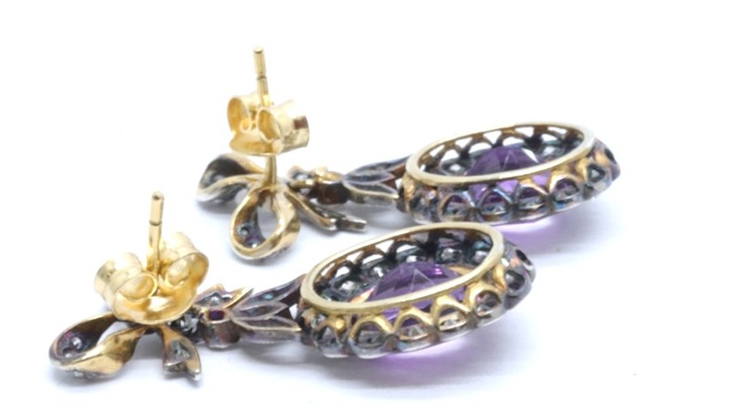 Zlaté náušnice s diamanty a ametysty. Žluté zlato 750/1000, stříbro 940/1000. Přírodní ametysty, celková váha 3,5 ct. Přírodní diamanty, kvalita SI1 - SI2, barva H - I, celková váha 1,15 ct. Váha náušnic: 4,6 g. Rozměr náušnic: 2,8 cm x 1,3 cm. Osvědčení puncovního úřadu.