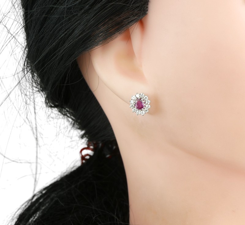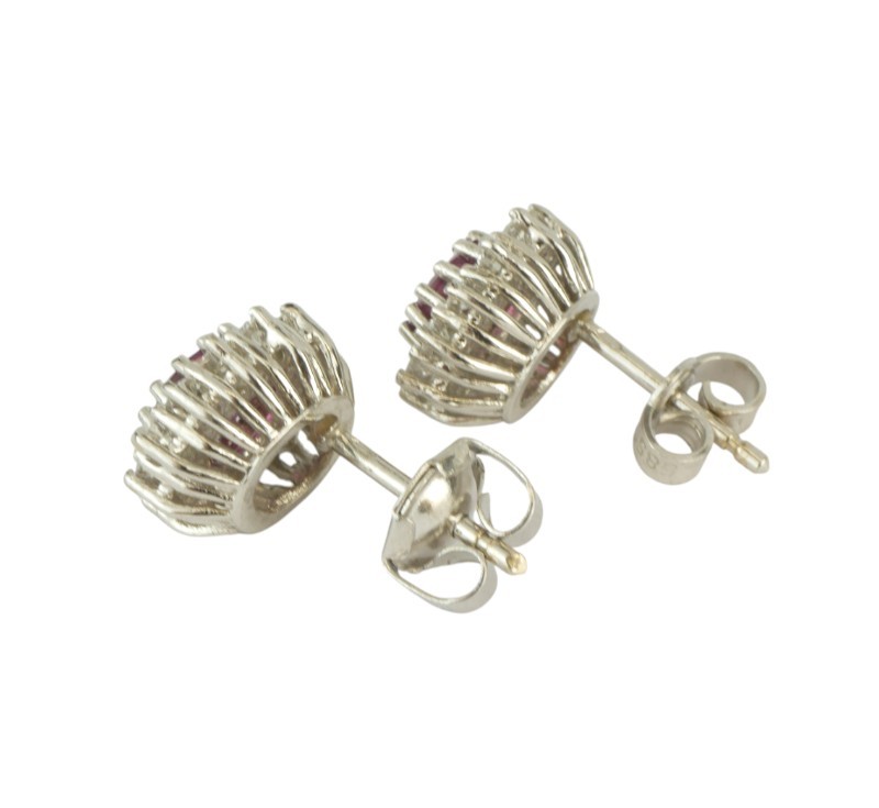 Elegantní, zářivé náušnice s centrálním přírodním rubínem oválného smíšeného brusu o váze 0,45 ct, celkové váze tedy 0,90 ct, původem pravděpodobně z Thajska, rámováno přírodními diamanty kulatého briliantového brusu o celkové váze 0,60 ct (0,025 ct - 24 ks), kvalita velmi dobrá. Pečlivě fasováno krapnami v jemně stavěné hlavici. Precizní západoevropská zlatnická práce ze 70. až 80. let 20. století. Zhotoveno z bílého 14 karátového zlata, tj. o ryzosti 585/1000; nově opatřeno puncem Z-58 (labuť 4) na dřících, ryzostní číslo a další značení na puzetách. Hmotnost 3,00 g, délka hlavice 10 mm, šířka 9 mm. Puzetové zapínání v pořádku (jedna nepůvodní), ve velmi zachovalém stavu, odborně vyčištěno a vyleštěno zlatníkem. Součástí odborný posudek.