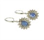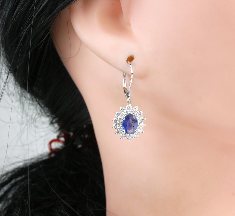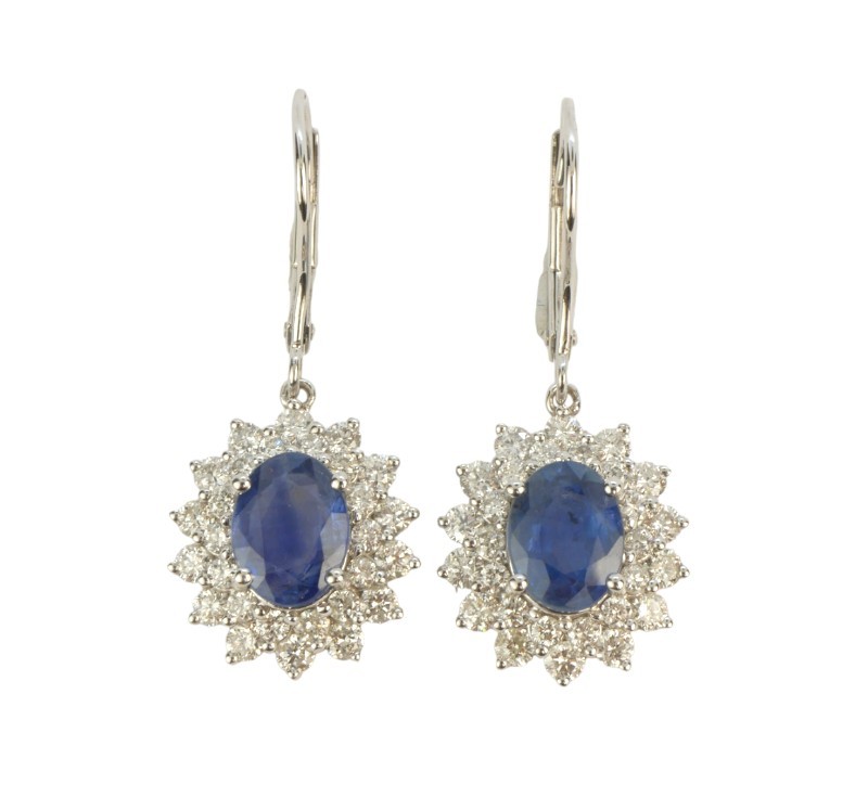 Náušnice z bílého zlata ryzosti 585/1000 zdobené diamanty o celkové hmotnosti 1,40 ct a safíry o hmotnosti 2,20 ct. Celková hmotnost obou náušnic je 3,68 g. Rozměry 1,5 x 1,0 cm.