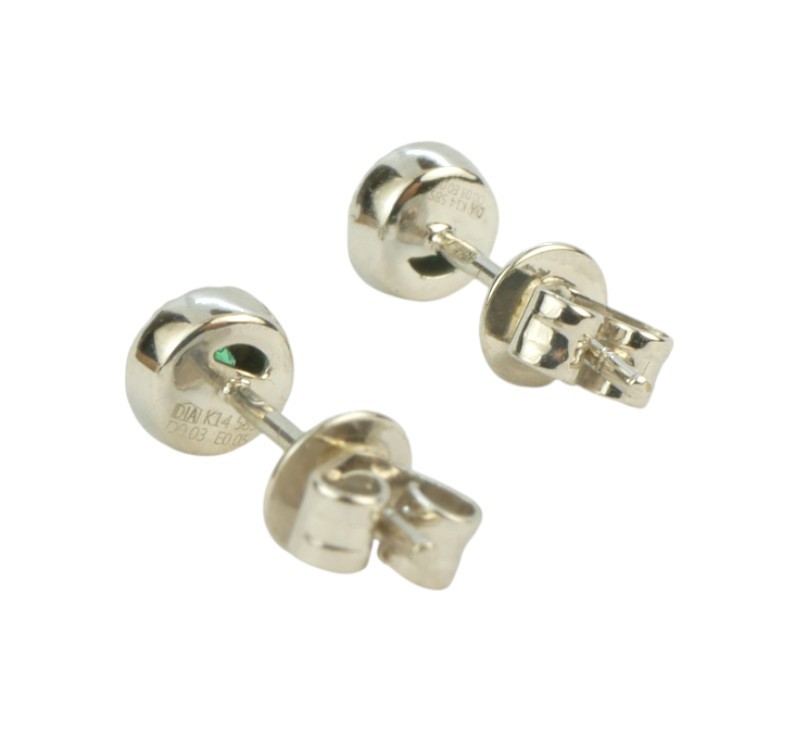 Náušnice z bílého zlata ryzosti 585/1000 zdobené diamanty o celkové hmotnosti 0,06 ct a smaragdy o hmotnosti 0,10 ct. Celková hmotnost obou náušnic je 1,16 g. Průměr 0,5 cm.