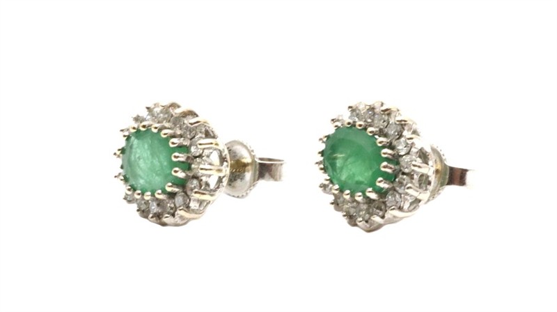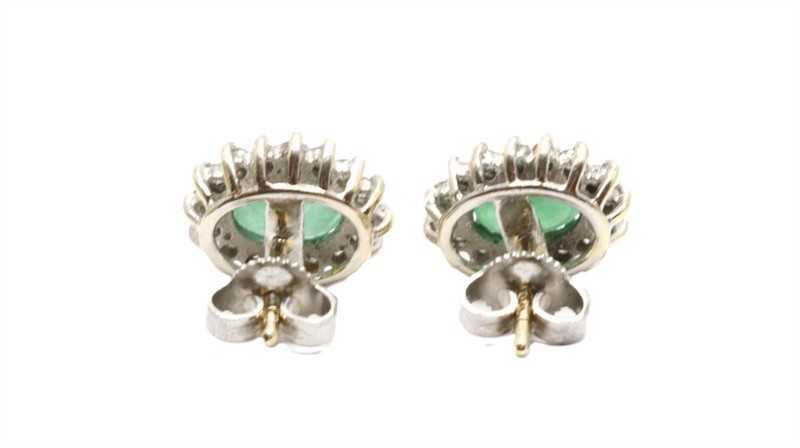 Zlaté náušnice s diamanty a smaragdy. Bílé zlato 375/1000. Přírodní smaragdy, celková váha 1,6 ct. Přírodní diamanty, kvalita SI1 - I1, barva H - J, celková váha 0,45 ct. Váha náušnic: 2,99 g. Rozměr náušnic: 1,2 cm x 1 cm.