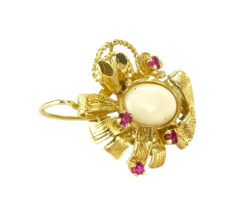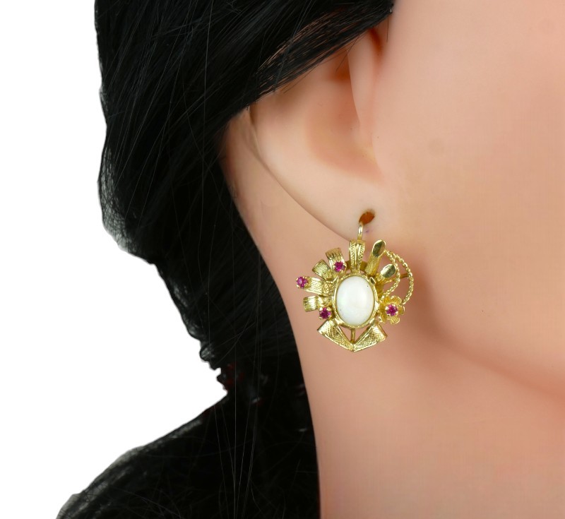Velmi zdobné originální náušnice vyrobené ze žlutého zlata ryzosti 585/1000 (punc labuť) zdobené oválnými opály a červenými kamínky. Rozměry 2,0 x 2,2 cm. Celková hmotnost 9,56 g.