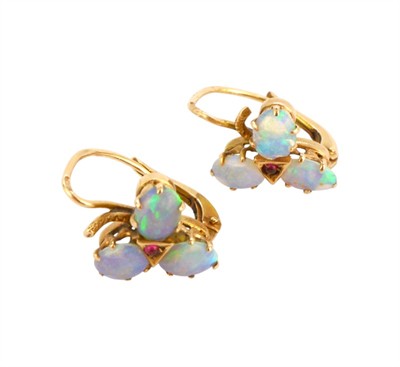 Nevšední náušnice vyrobené ze žlutého zlata ryzosti 585/1000 (punc liška) zdobené krásně zbarvenými opály a centrálními červenými rubíny. Rozměry 1,4 x 1,1 cm. Celková hmotnost 1,90 g. Jemné náušnic z počátku 20. století.