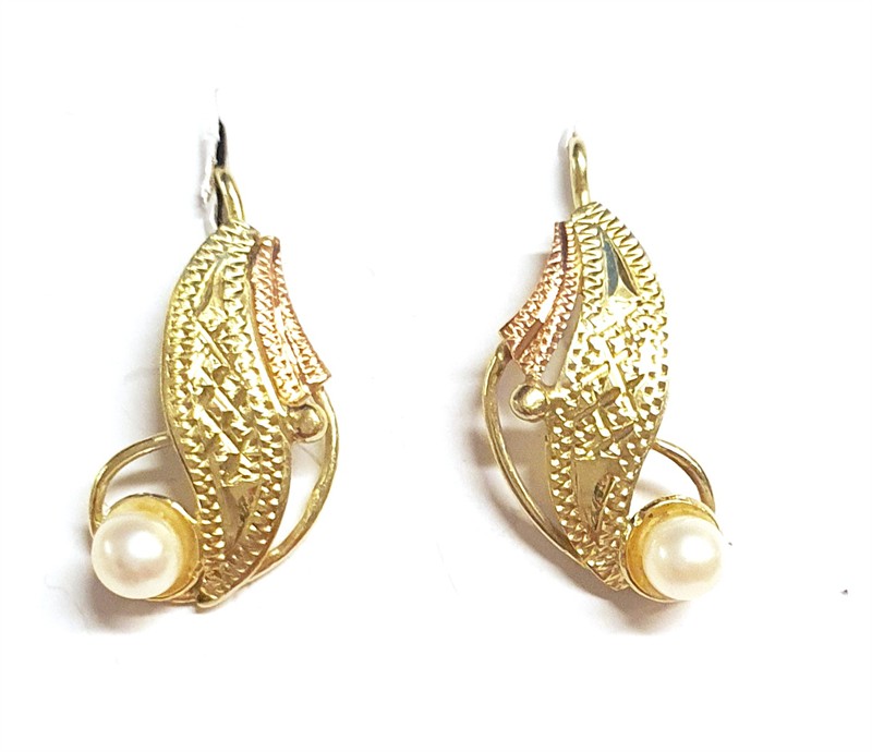 Náušnice vyrobené z kombinace žlutého a růžového zlata ve tvaru lístků ryzosti 585/1000 jsou zdobené drobnými kultivovanými perlami. Rozměry 1,8 x 1,1 cm. Celková hmotnost 2,48 g.