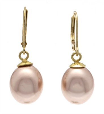 Zlaté visací náušnice s perlami z mušloviny barvy champagne o rozměrech 12 x 10 mm, zlato o ryzosti 585,333/1000 o celkové hmotnosti 4,63 g, délka náušnic 2,9 cm mušlovina - perleť je vyráběna z vnitřní vrstvy lastur, následně je tvarována a lešťena, vyznačuje se vysokým leskem, mívá dokonalý, hladký tvar, Perleť je považována za symbol čistoty, moudrosti a klidu, navozuje zklidnění a upevňuje vztahy,