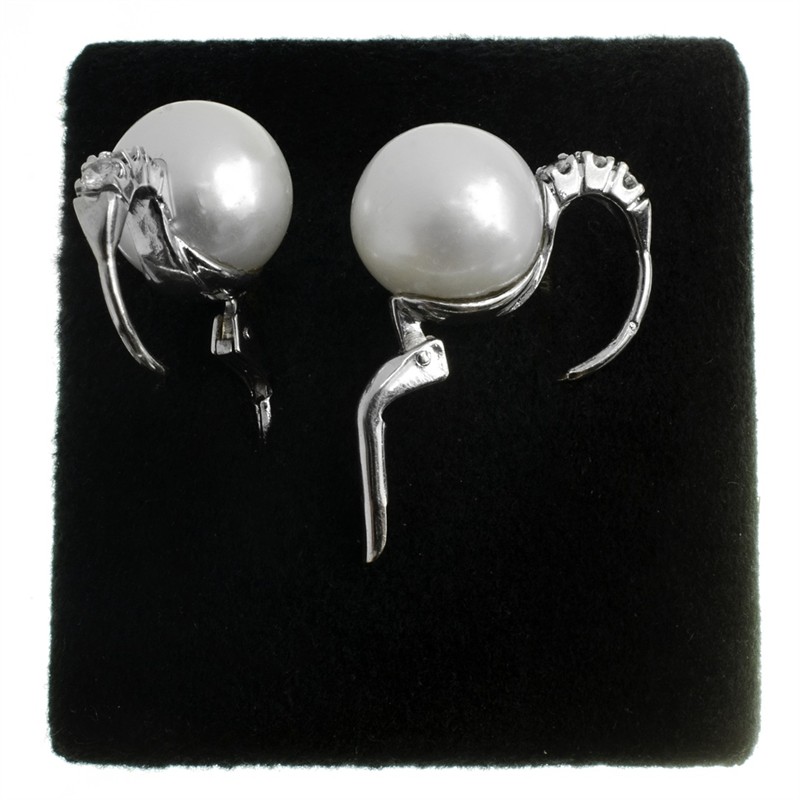 Náušnice z bílého zlata zdobené mořskými perlami a brilianty. Au 750/1000, hmotnost: 6,95g. Čechy, 2. polovina 20. století. Délka 1,6cm, průměr perly: 1 cm.