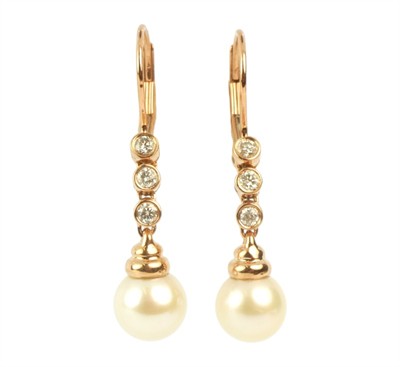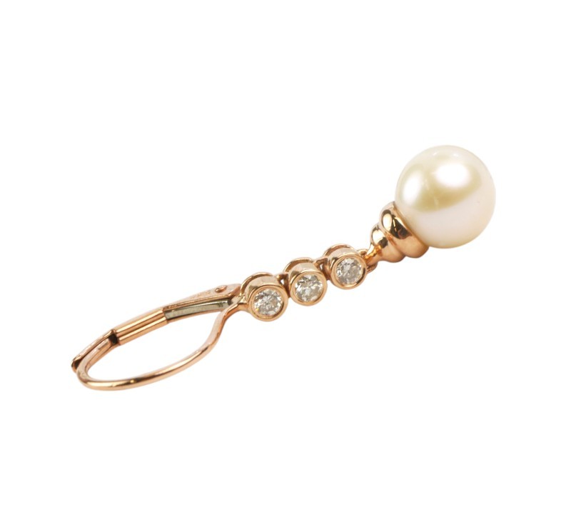Visací náušnice z růžového zlata ryzosti 585/1000 jsou osazeny perlami a diamanty briliantového brusu o celkové hmotnosti 0,24 ct. Celková hmotnost obou náušnic je 3,10 g. Délka náušnice 3,3 cm.