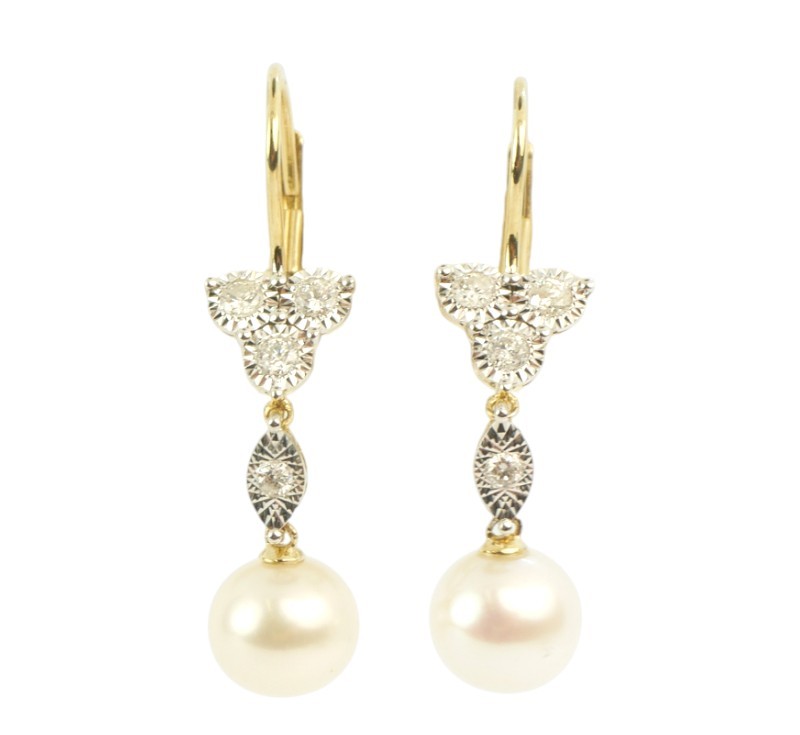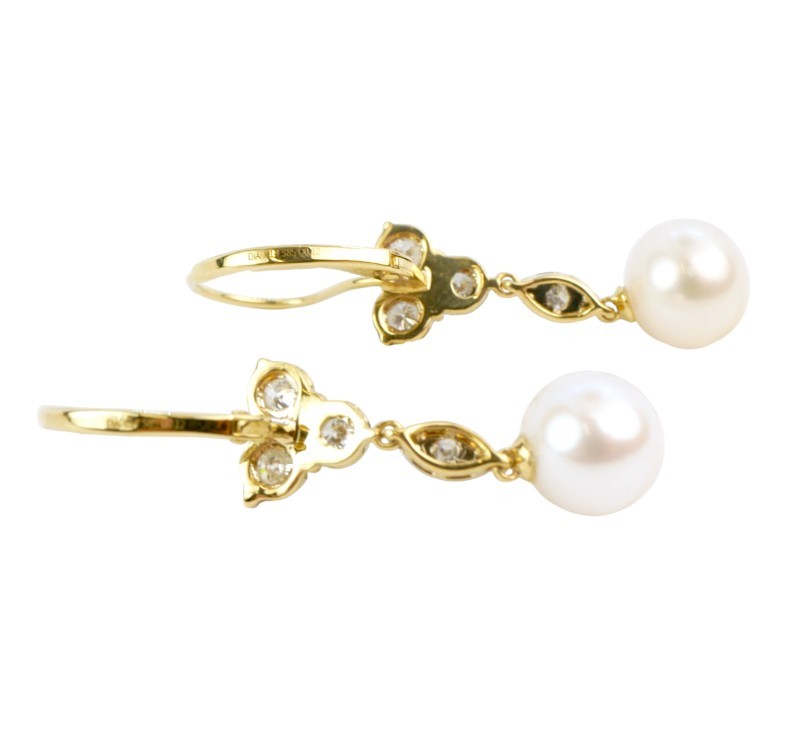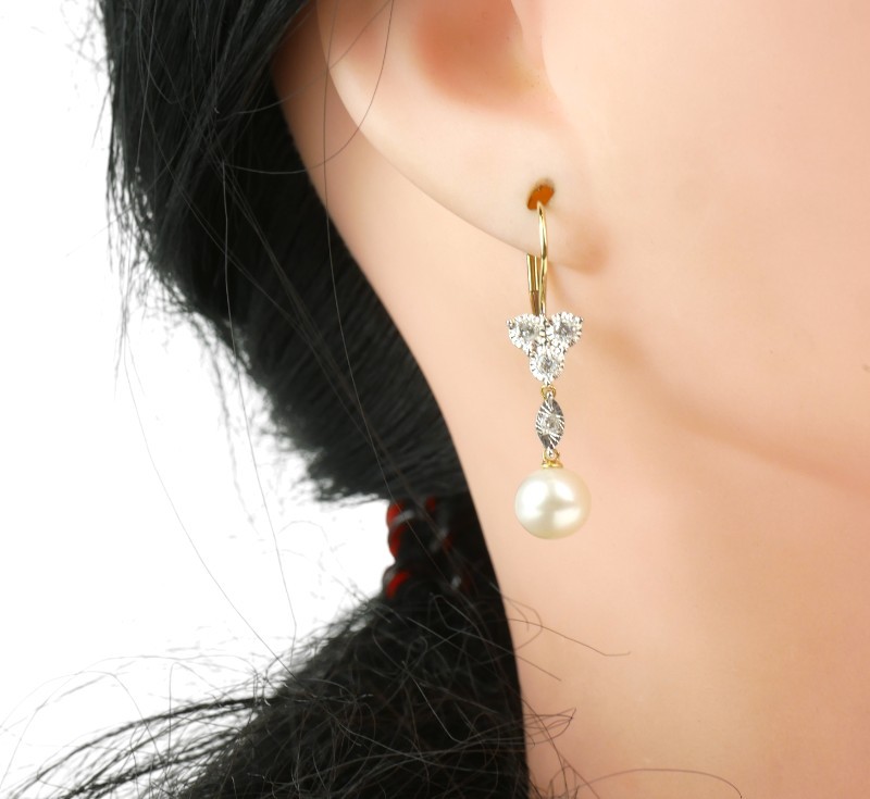 Visací náušnice ze žlutého a bílého zlata ryzosti 585/1000 jsou osazeny perlami a diamanty briliantového brusu o celkové hmotnosti 0,24 ct. Celková hmotnost obou náušnic je 2,73 g. Délka náušnice 3,3 cm.