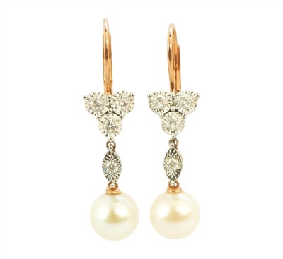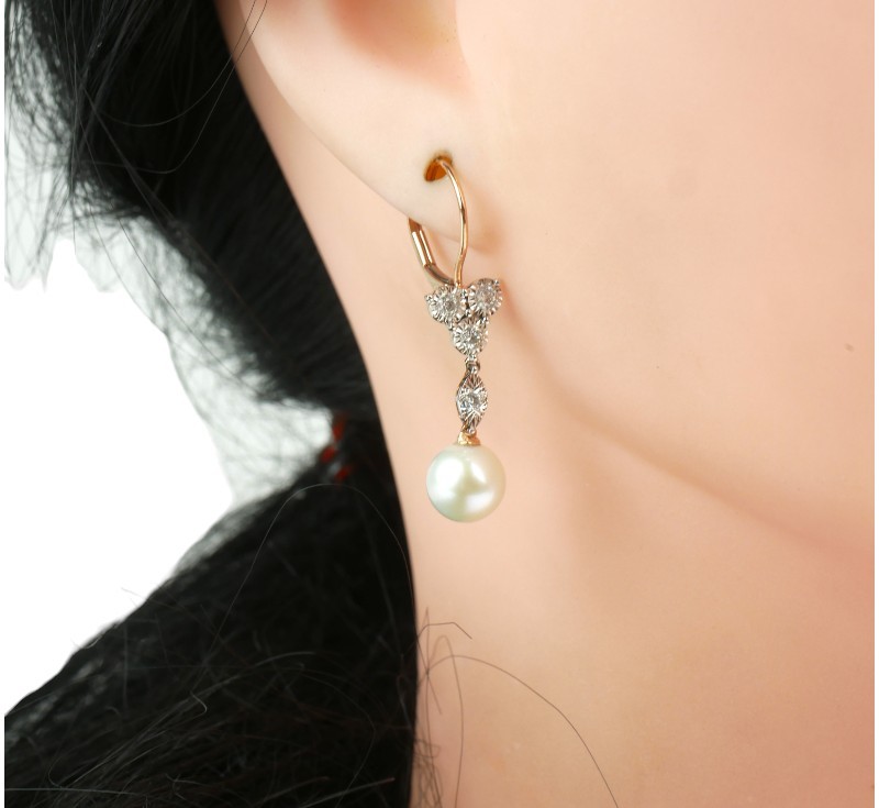 Visací náušnice z růžového zlata ryzosti 585/1000 jsou osazeny perlami a diamanty briliantového brusu o celkové hmotnosti 0,24 ct. Celková hmotnost obou náušnic je 2,89 g. Délka náušnice 3,3 cm.