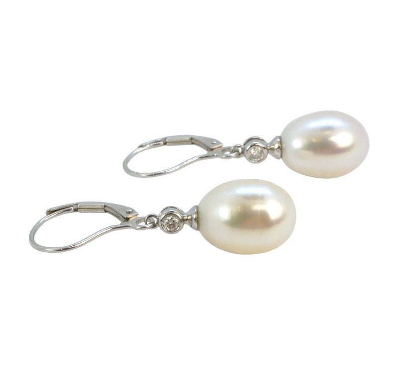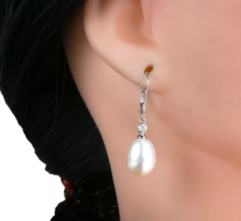 Visací náušnice z bílého zlata ryzosti 585/1000 jsou osazeny perlami a diamanty briliantového brusu o celkové hmotnosti 0,06 ct. Celková hmotnost obou náušnic je 4 g. Délka náušnice 3,4 cm.