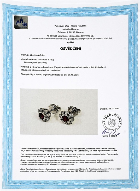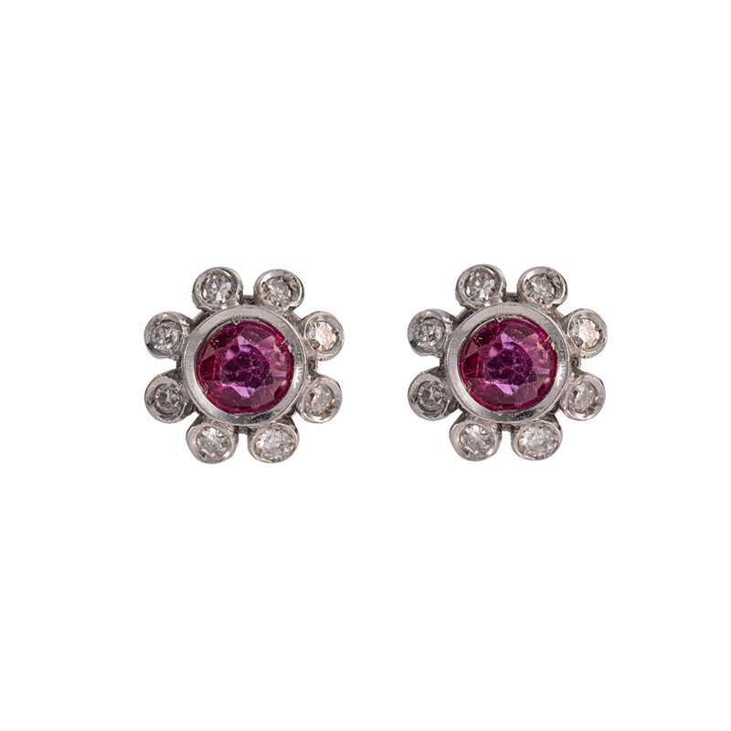 Bílé zlato o ryzosti 585/1000 váha 2,75 g přírodní růžový safír 2 ks 0,23 ct, průměr 4,0 mm přírodní diamant 16 ks 0,24 ct průměr 0,9 cm výborný stav osvědčení puncovního úřadu kameny s garancí pravosti zkontrolované v gemologické laboratoři