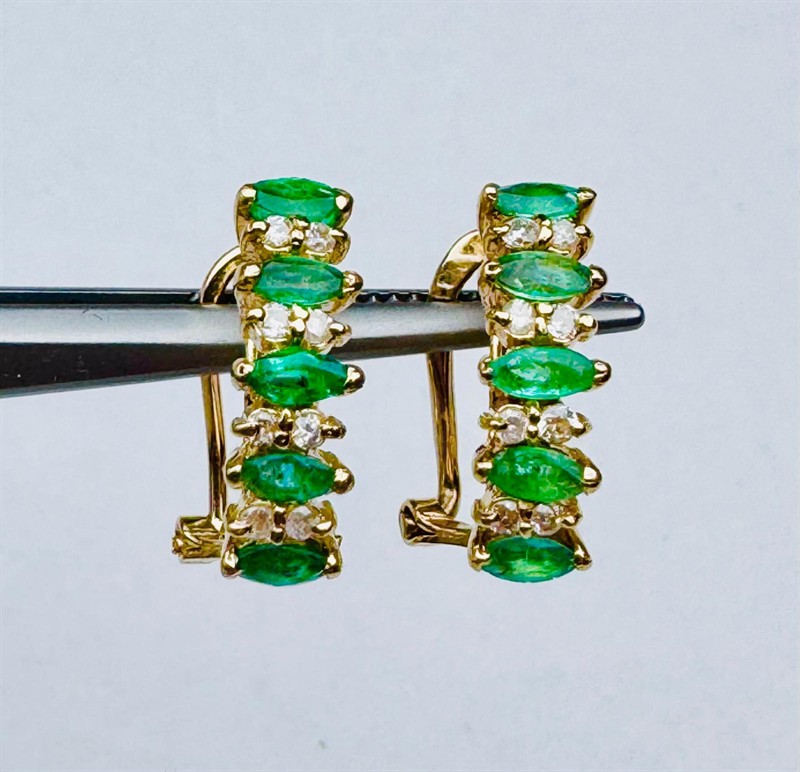 Zlaté náušnice s přírodními smaragdy a diamanty, náušnice jsou vyrobené z zlata 750/1000 a váží 3,3 gramů. Přírodní smaragdy a přírodní diamanty - brilianty. Rozměr 16x7 mm.