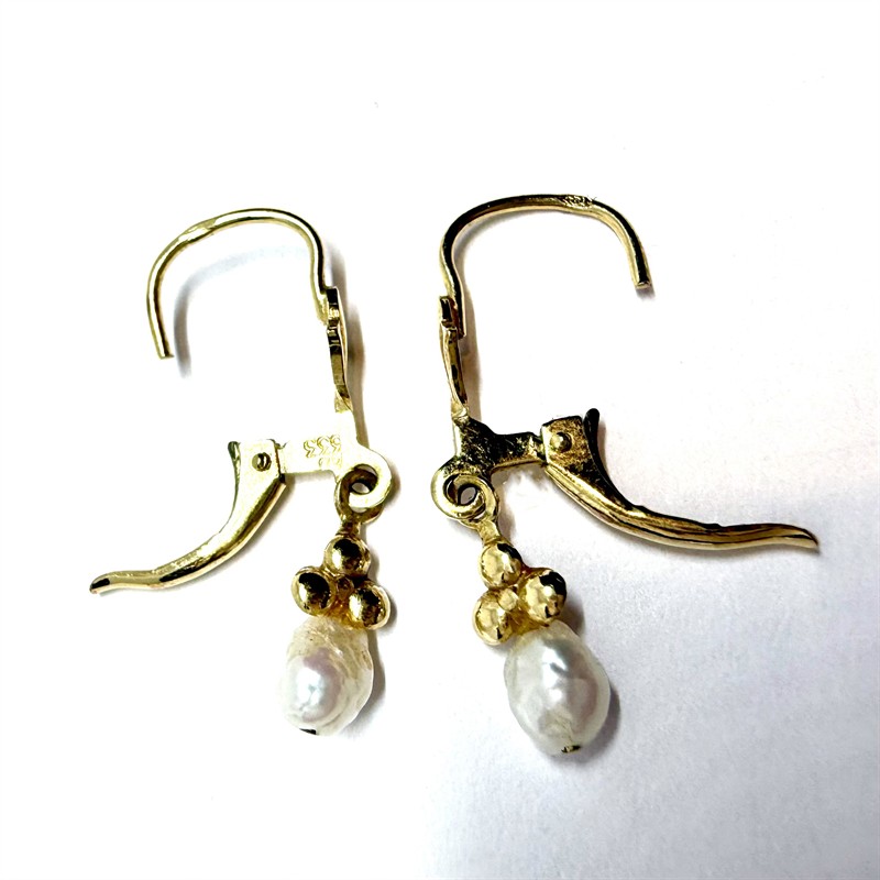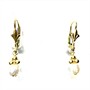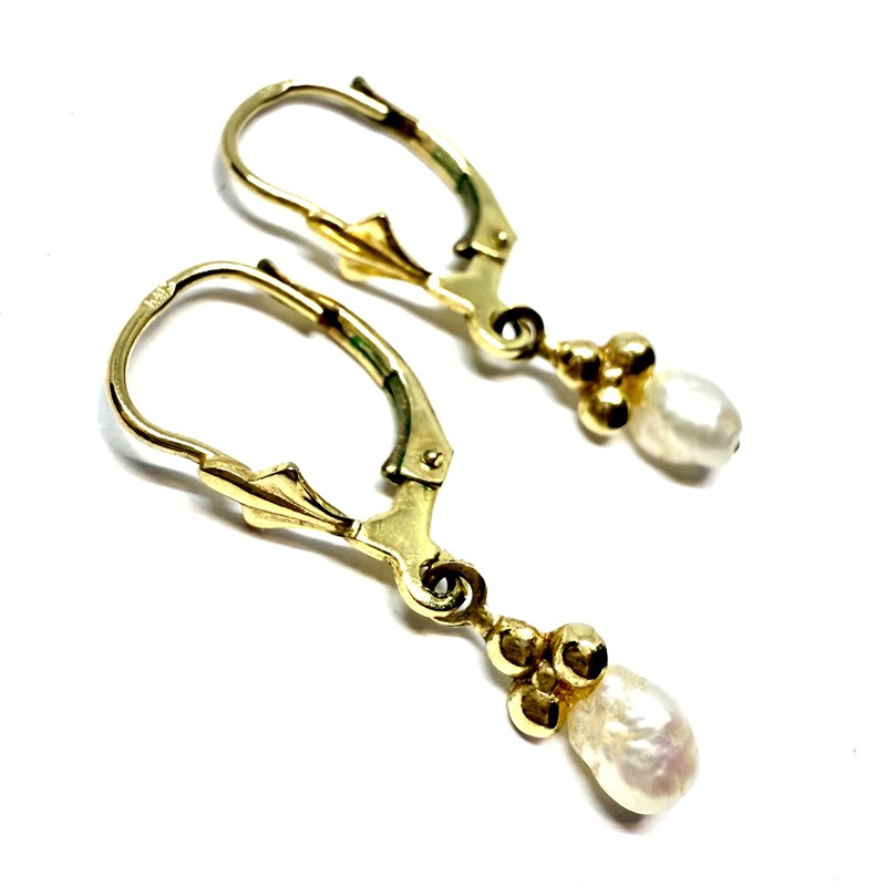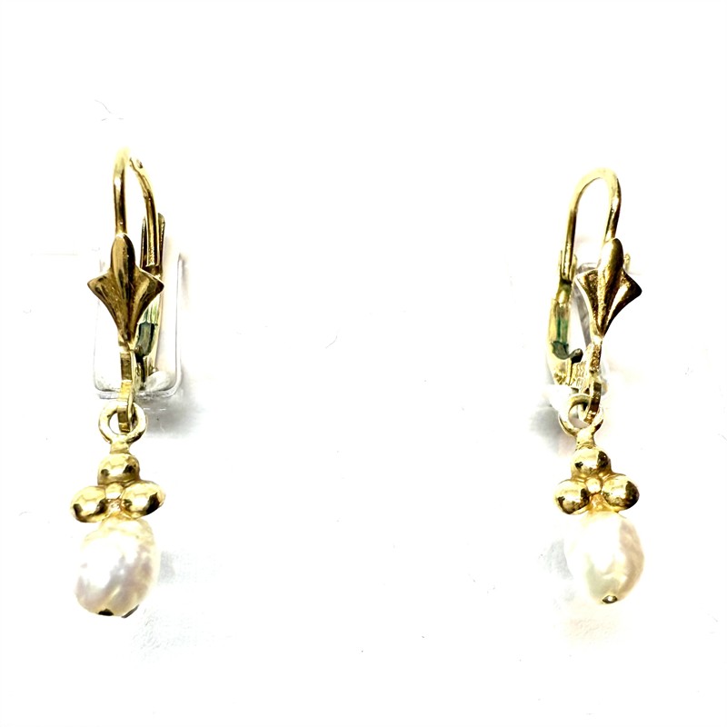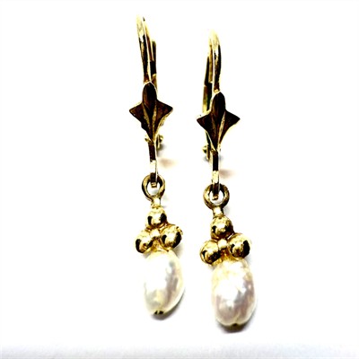 Něžné, závěsné náušnice. Zhotoveny ze zlata ryzosti 333/1000, o celkové váze 0,98 g. Náušnice zdobí kinetický ověs s bílou říční perlou. Délka 2,5 cm. Půvabný, příjemně nositelný šperk v perfektním stavu.