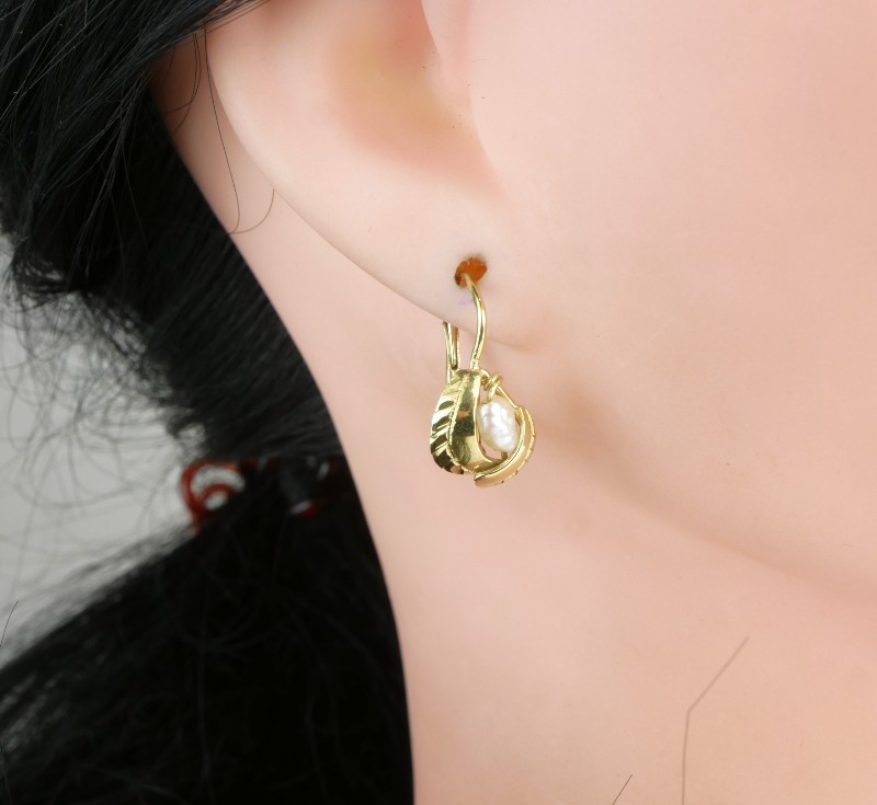 Náušnice ze žlutého zlata ryzosti 585/1000 s říčními perličkami. Celková hmotnost obou náušnic je 2,60 g. Délka náušnice je 1,9 cm.