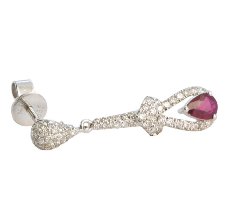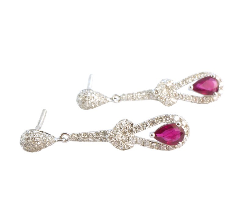Visací náušnice z bílého zlata ryzosti 585/1000 jsou osazeny rubíny a diamanty briliantového brusu o celkové hmotnosti 1,0 ct. Celková hmotnost obou náušnic je 4,15 g. Délka náušnice 3,3 cm.
