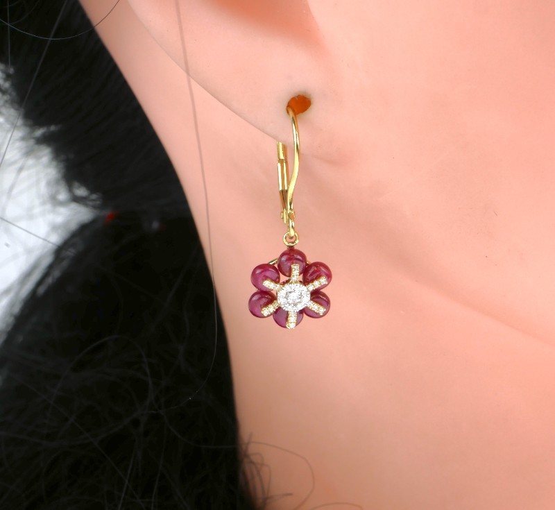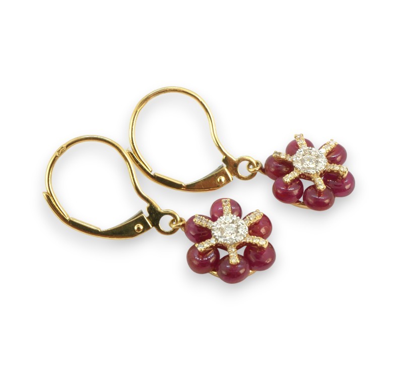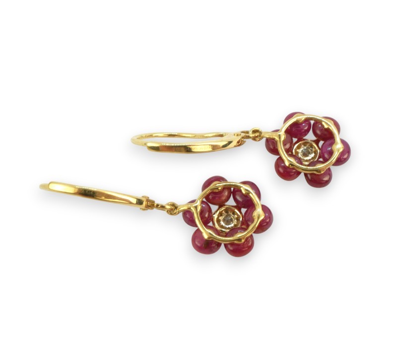 Náušnice ze žlutého zlata ryzosti 585/1000 s rubíny a diamanty briliantového brusu o celkové hmotnosti 0,20 ct. Celková hmotnost obou náušnic je 2,40 g. Průměr ověsu 1 cm.