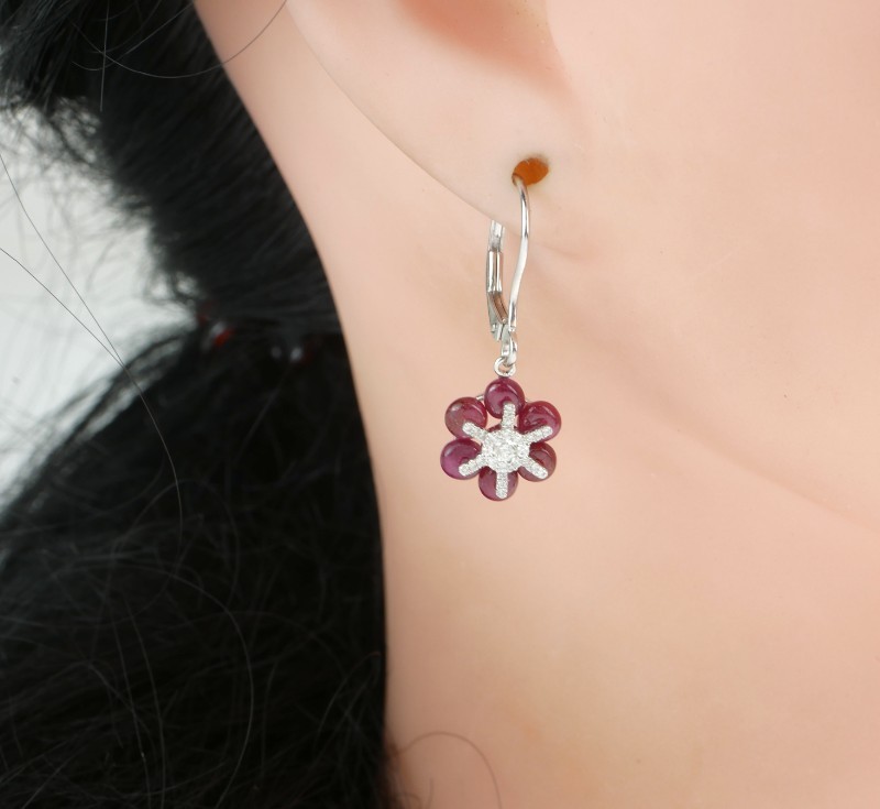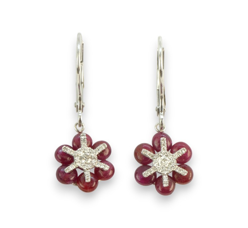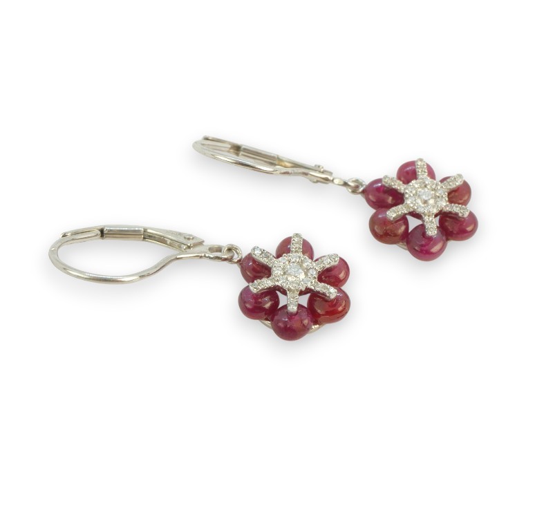 Náušnice z bílého zlata ryzosti 585/1000 s rubíny a diamanty briliantového brusu o celkové hmotnosti 0,20 ct. Celková hmotnost obou náušnic je 2,40 g. Délka celé náušnice je 2,8 cm, průměr ověsu 1 cm.