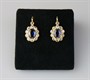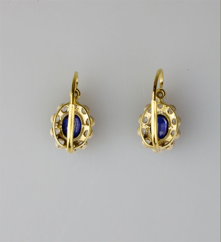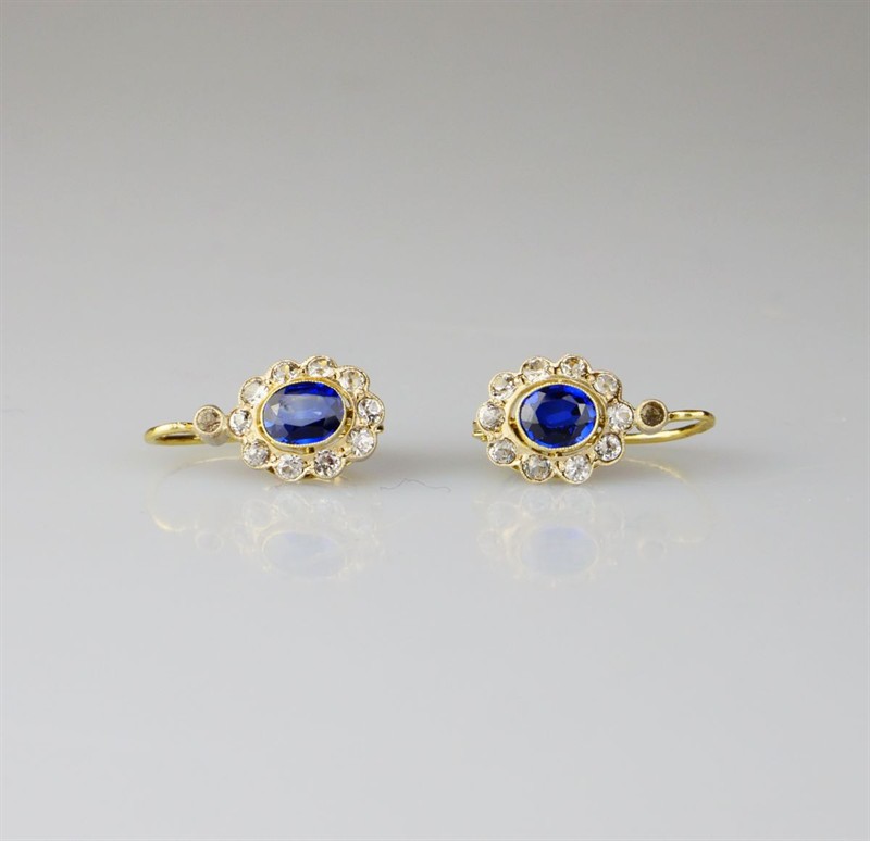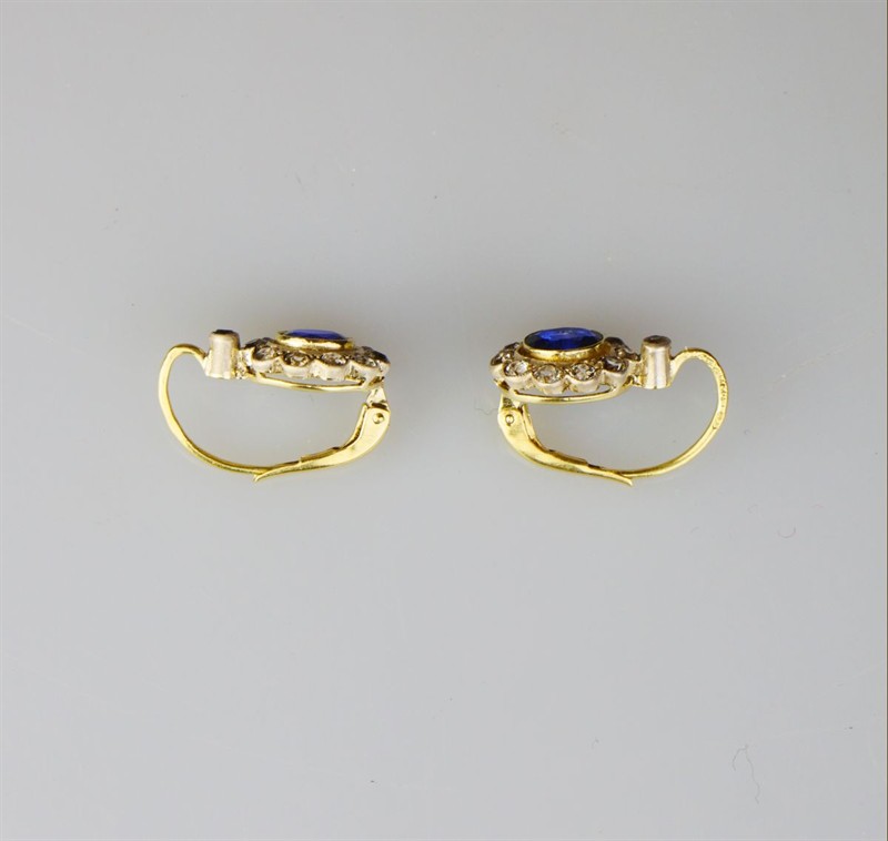 zlaté náušnice se syntetickým modrým safírem a bezbarvými leukosafíry, kameny vsazené ve stříbře, Au btto 2,95 g/585/1000, Rakousko, kolem r. 1930, dobový rakouský punc a československý dovozový punc (lyra); rozměry 1,9 x 1,3 x 1 cm