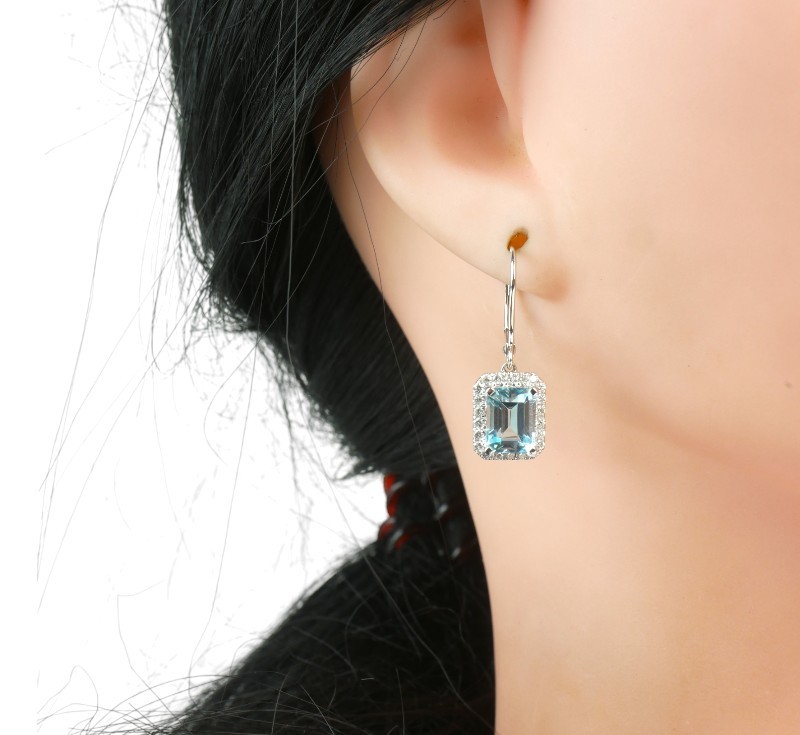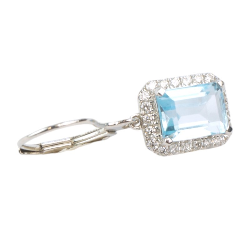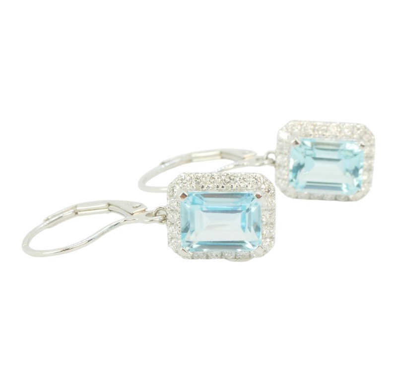 Visací náušnice z bílého zlata ryzosti 585/1000 jsou osazeny topazy a diamanty briliantového brusu o celkové hmotnosti 0,46 ct. Celková hmotnost obou náušnic je 3,26 g. Délka náušnice 2,6 cm.