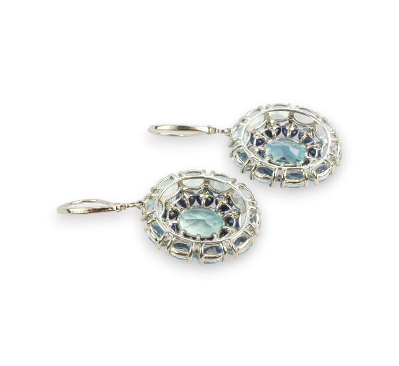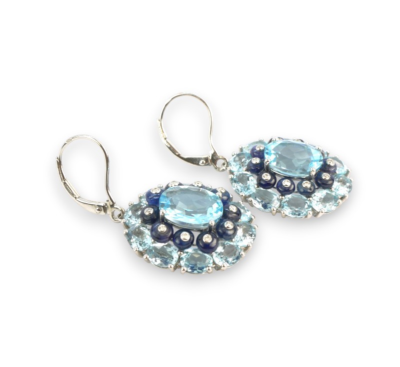 Náušnice z bílého zlata ryzosti 585/1000 se safíry, topazy a diamanty briliantového brusu o celkové hmotnosti 0,10 ct. Celková hmotnost obou náušnic je 8,95 g. Rozměry ověsné části 2,2 x 2 cm.