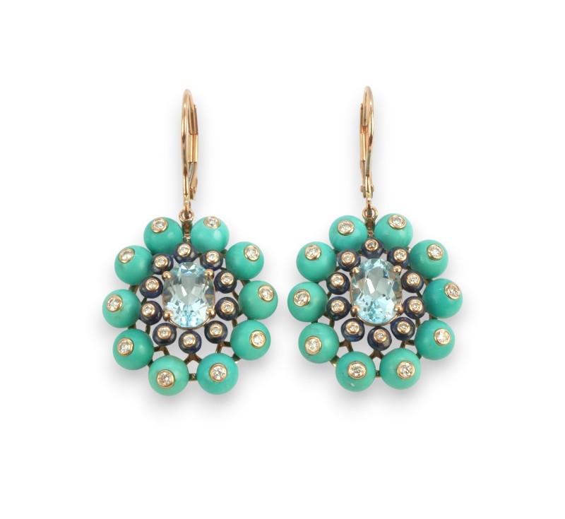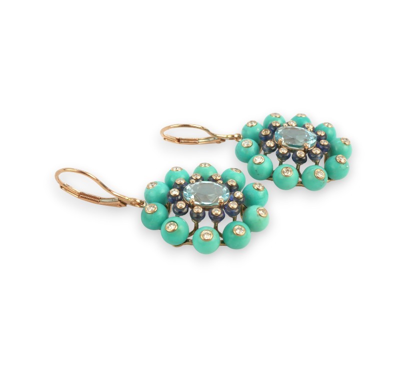 Zlaté náušnice s tyrkysy, topazy, safíry a diamanty