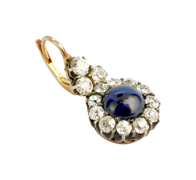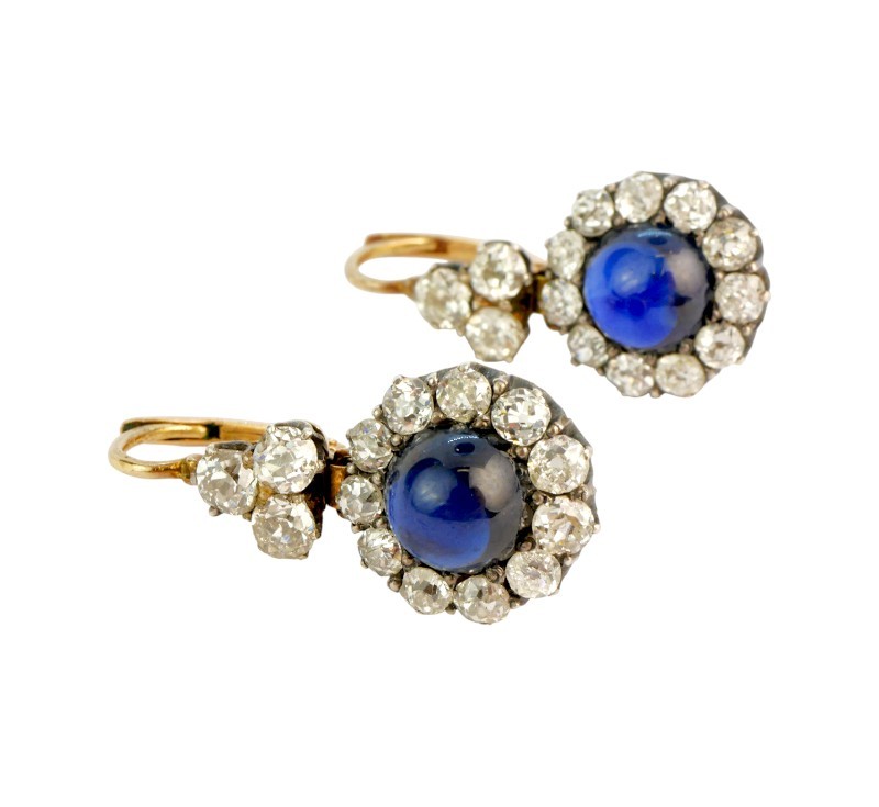 Náušnice ze žlutého zlata ryzosti 585/1000 s přírodními safíry celkové hmotnosti 4,8 ct (2,4 ct každý) a diamanty briliantového brusu celkové hmotnosti 2,61 ct. Háčky jsou zhotoveny ze zlata ryzosti 530/1000 a kameny jsou zasazeny ve stříbrném lůžku. Celková hmotnost obou náušnic je 6,67 g. Vyhotoveno osvědčení Puncovního úřadu a znalecký posudek gemologa.