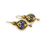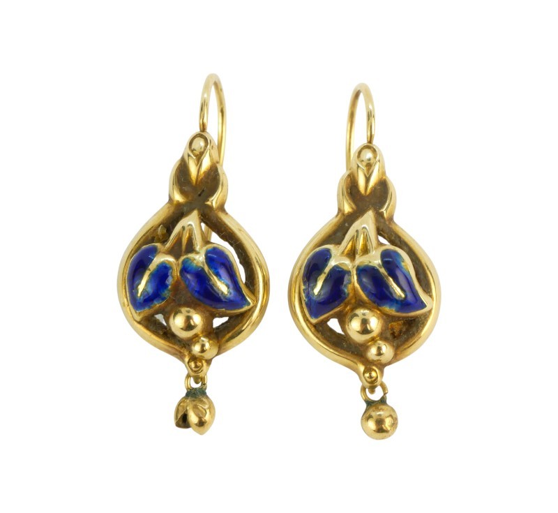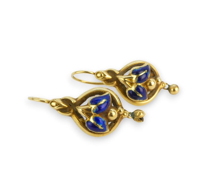 Náušnice ze žlutého zlata ryzosti 585/1000 (punc liška) zdobené kobaltově modrými smalty. Rozměry 2,5 x 1,3 cm, celková hmotnost náušnic 2,15 g.