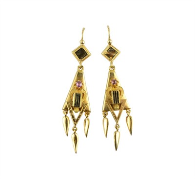 Visací biedermeier náušnice ze žlutého zlata ryzosti 750/1000 zdobené smalty a ověsy. Rozměry 6 x 1,5 cm. Celková hmotnost 8,93 g. Osvědčení Puncovního úřadu.