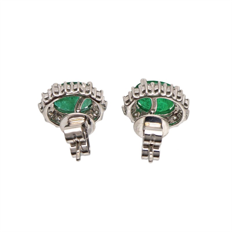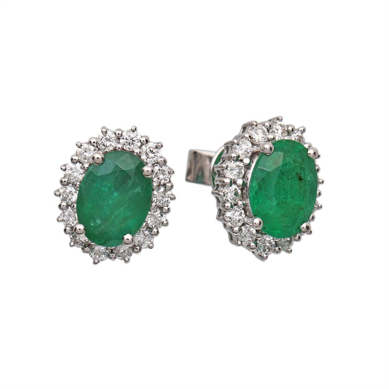 18 karátové bílé zlato 750/1000, celková hmotnost 3,70 g | Přírodní smaragdy 2,50 ct | Přírodní diamanty briliantové brusu 0,60 ct | Rozměry: 1,2 x 1 cm | Výborný stav | Přiložen atest z puncovního úřadu | Kameny zkontrolovány v gemologické laboratoři