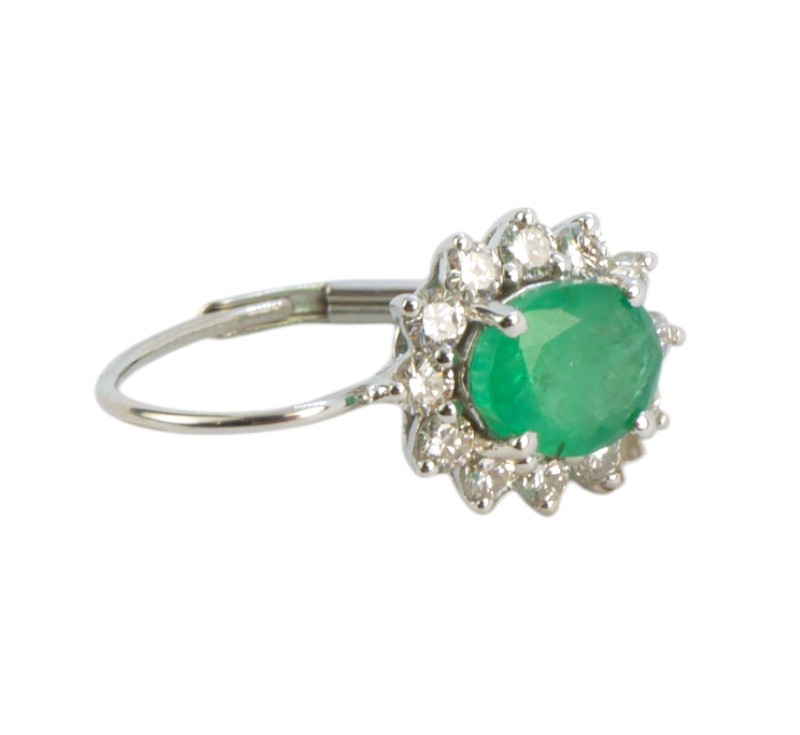 Náušnice z bílého zlata ryzosti 585/1000 jsou osazeny smaragdy a diamanty briliantového brusu o celkové hmotnosti 0,56 ct. Celková hmotnost obou náušnic je 2,03 g. Rozměry ověsu 10 x 9 mm.