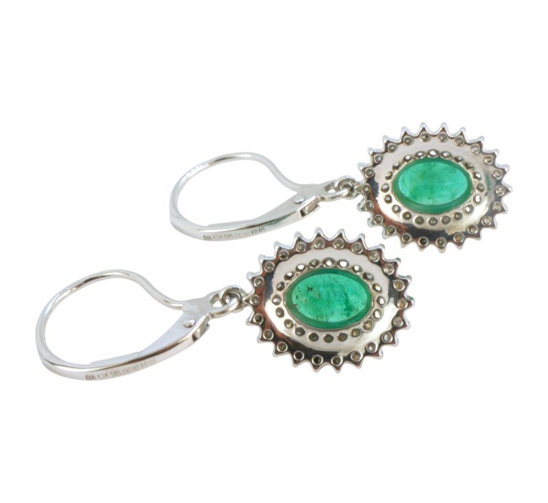 Náušnice z bílého zlata ryzosti 585/1000 jsou osazeny smaragdy a diamanty briliantového brusu o celkové hmotnosti 0,60 ct. Celková hmotnost obou náušnic je 3,24 g. Délka náušnice 2,9 cm.