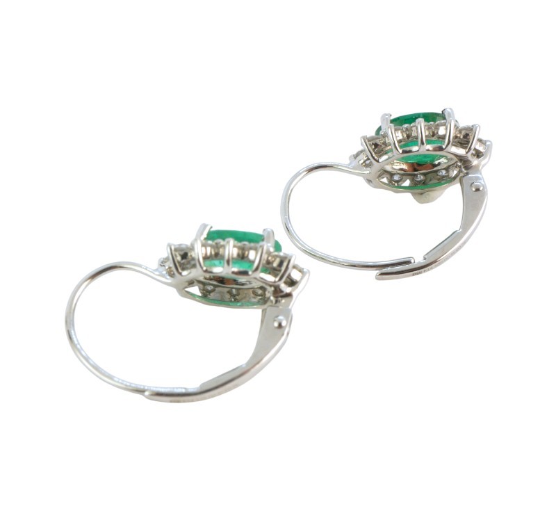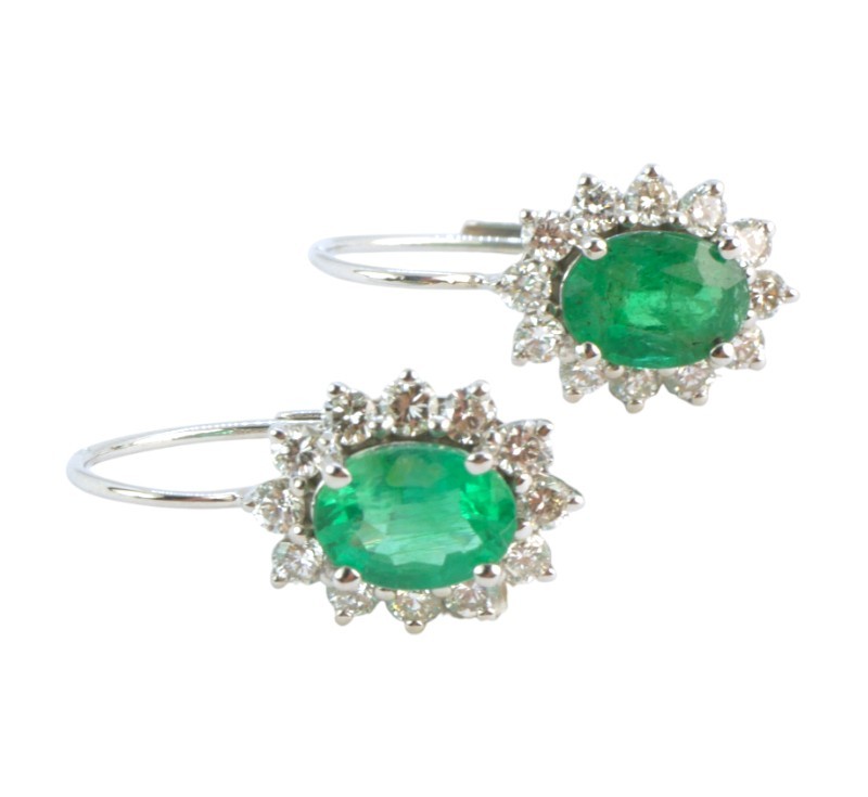 Náušnice z bílého zlata ryzosti 585/1000 jsou osazeny smaragdy a diamanty briliantového brusu o celkové hmotnosti 0,70 ct. Celková hmotnost obou náušnic je 2,36 g. Rozměry ověsu 11 x 9 mm.