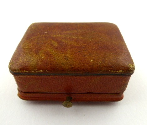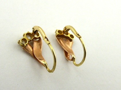 Čtrnáctikarátové zlato, syntetické leukosafíry. Ryzost Au 585/1000, celková hmotnost 2,40 g. Zlaté visací náušnice zajímavého tvaru evokující obrácený zvonkový květ zakončený syntetickými leukosafíry. Zapínání na dámský patent (klapku) . V originální etui ze světlé přírodní kůže. Značeno: československý punc lvíček, ryzost 585 a mistrovská značka. Československo 1929 - 1949. Výška 20 mm, šířka 10 mm.