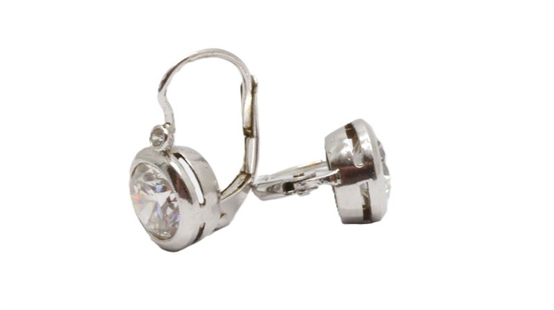 Zlaté náušnice se zirkony. Žluté zlato 585/1000. Kubické zirkony, celková váha 2,3 ct. Váha náušnic: 3,14 g. Rozměr: 1,5 cm x 0,9 cm.